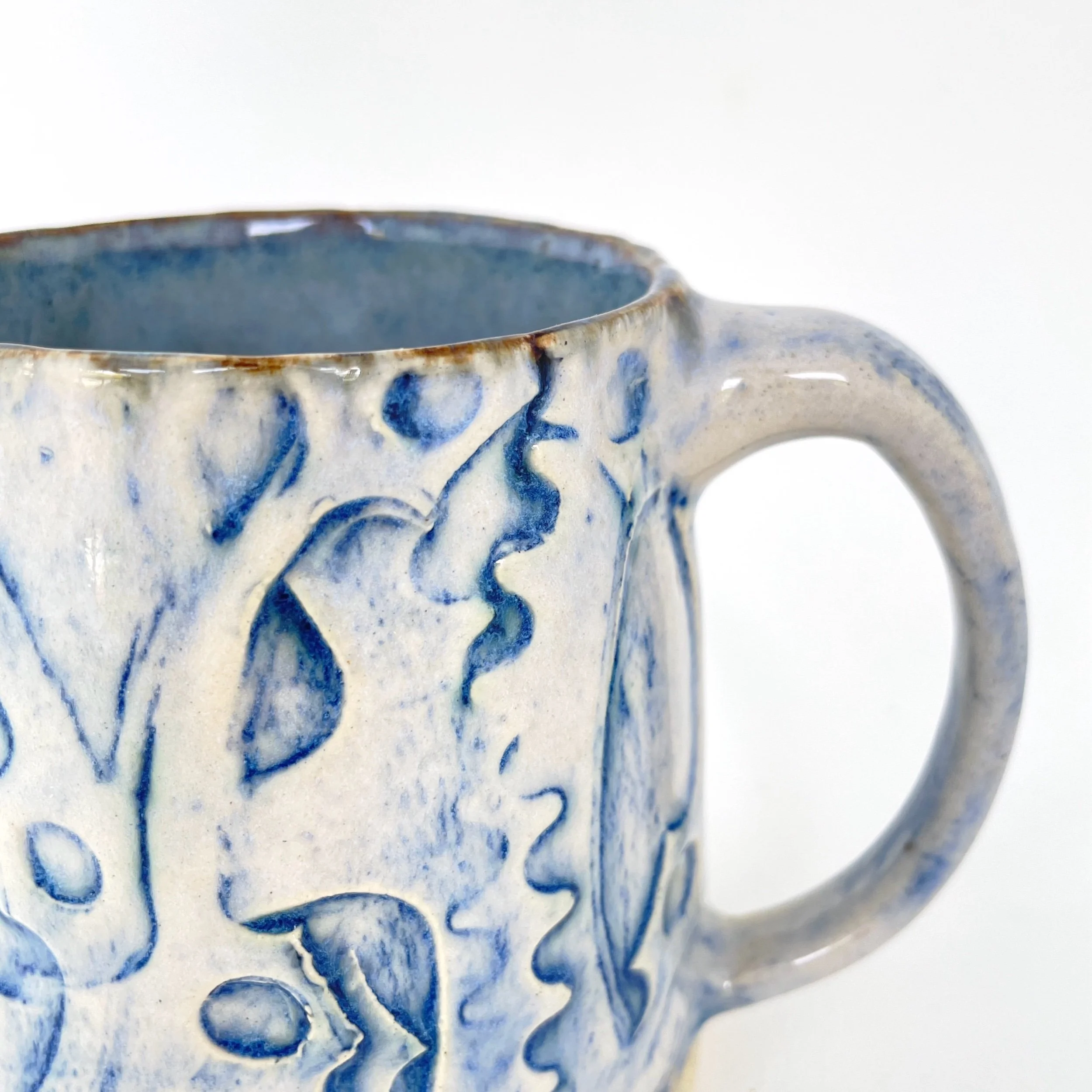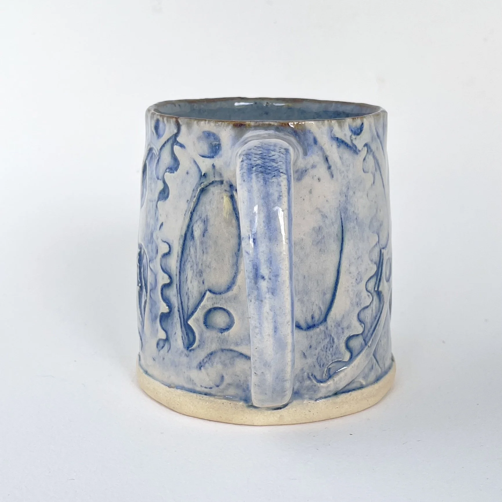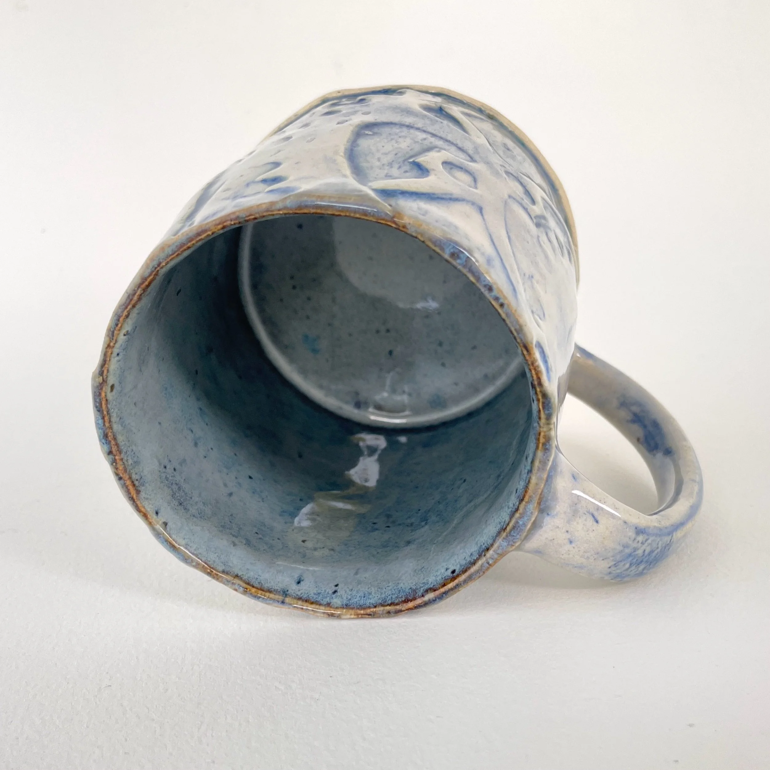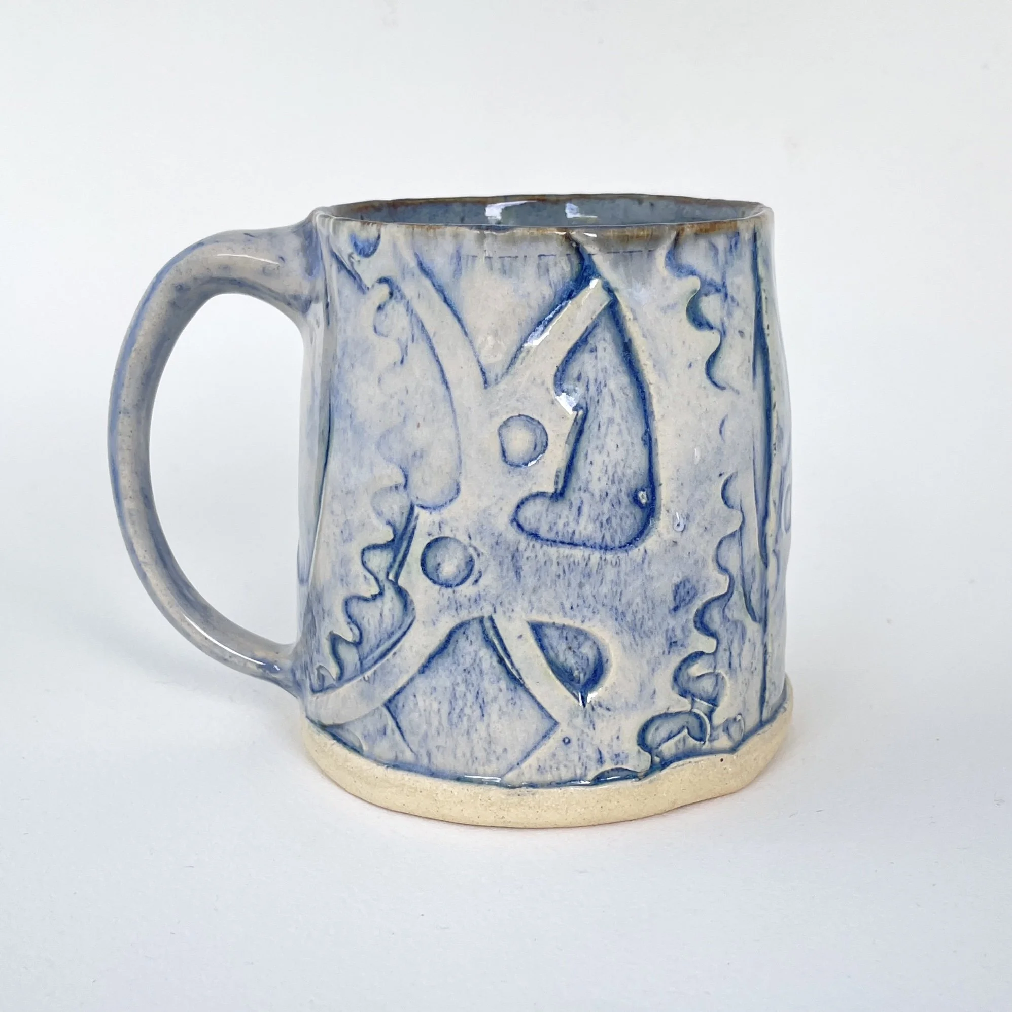 Handmade with both function and story, this ceramic mug carries the imprint of a bicycle flywheel, rolled into stoneware clay to create a striking, gear-like texture. Using a texture roller I crafted from a bike flywheel, I impressed the surface before forming a slab of clay into a mug, then finished it in a soft blue glaze. The impressions reveal the warmth of the clay beneath, highlighting the design with earthy contrast.