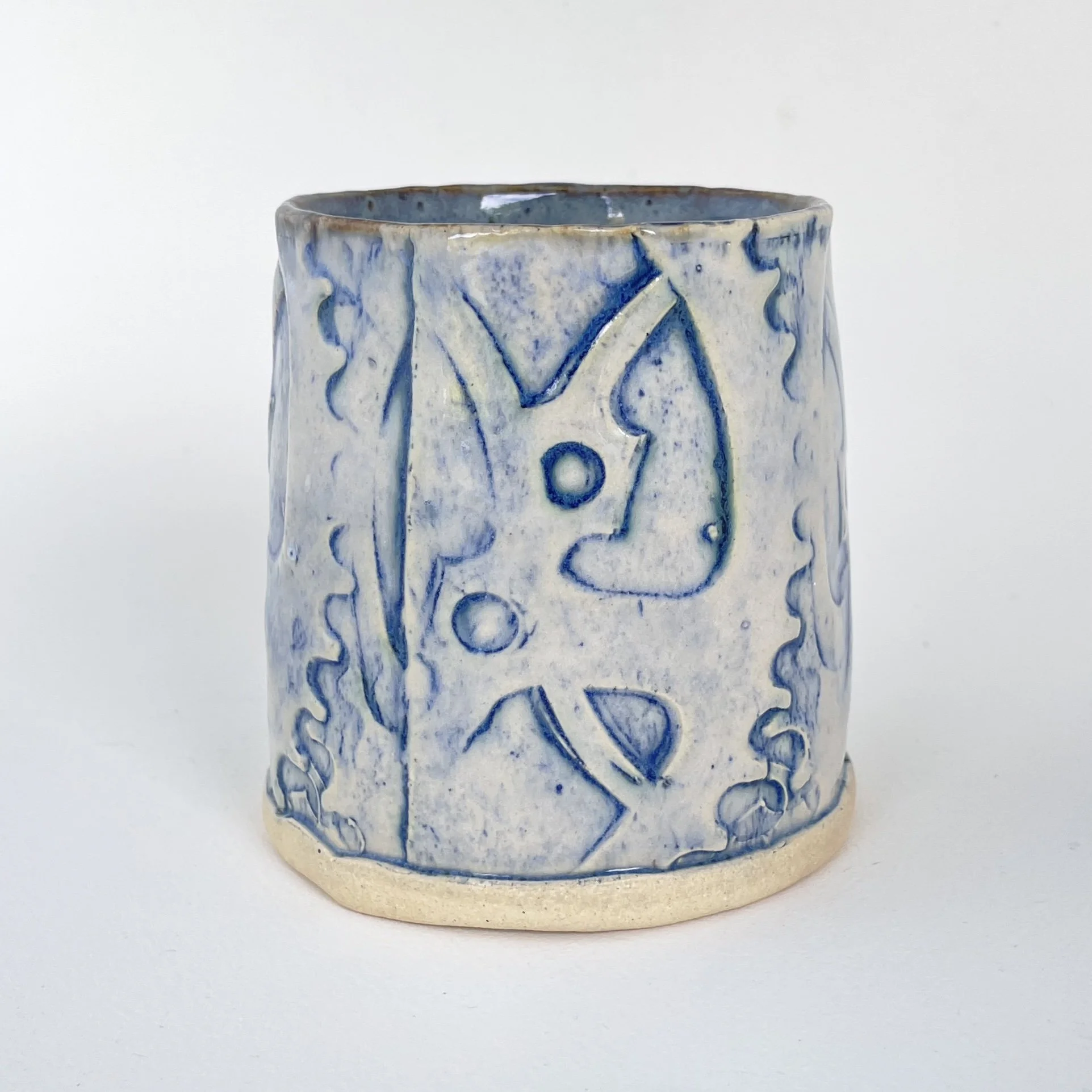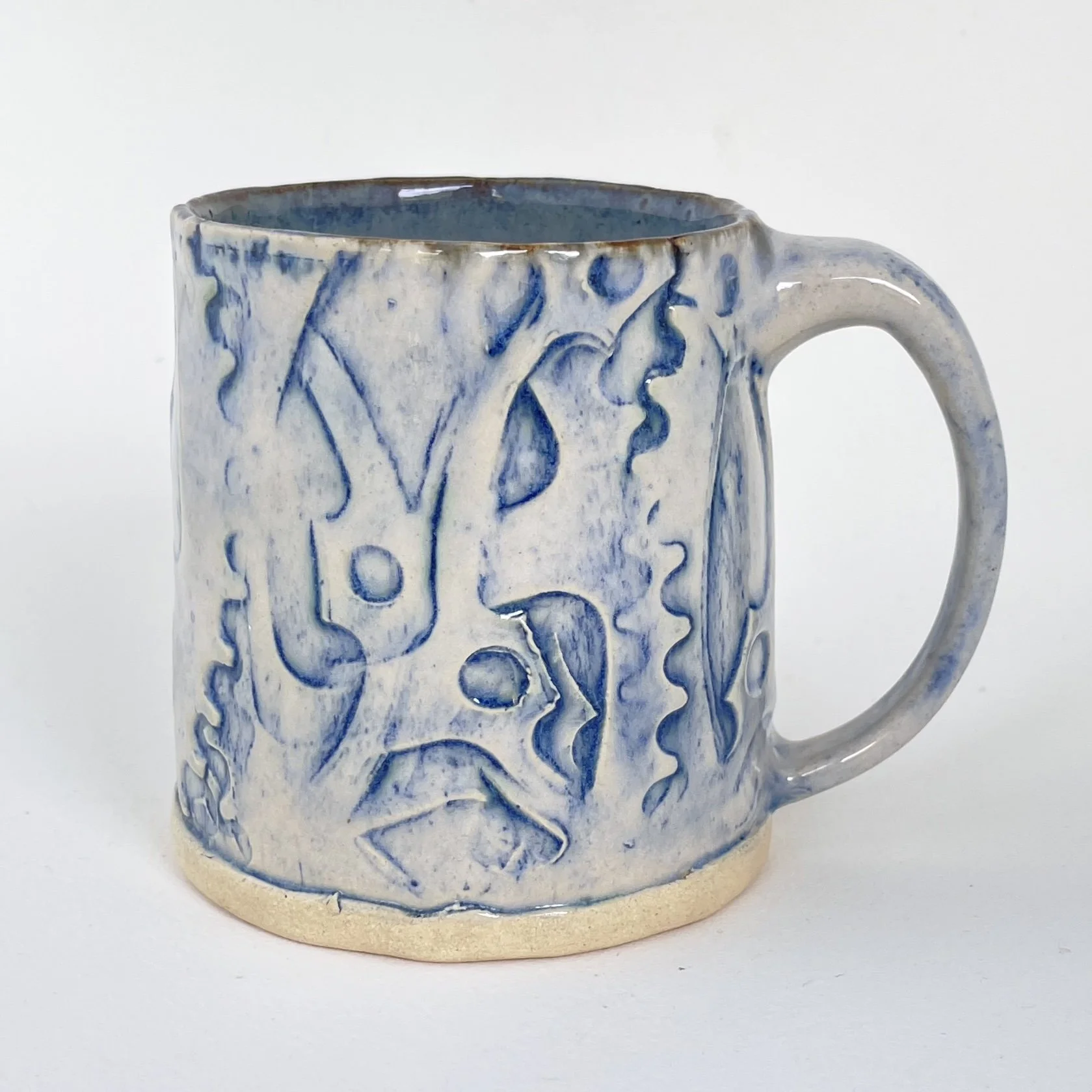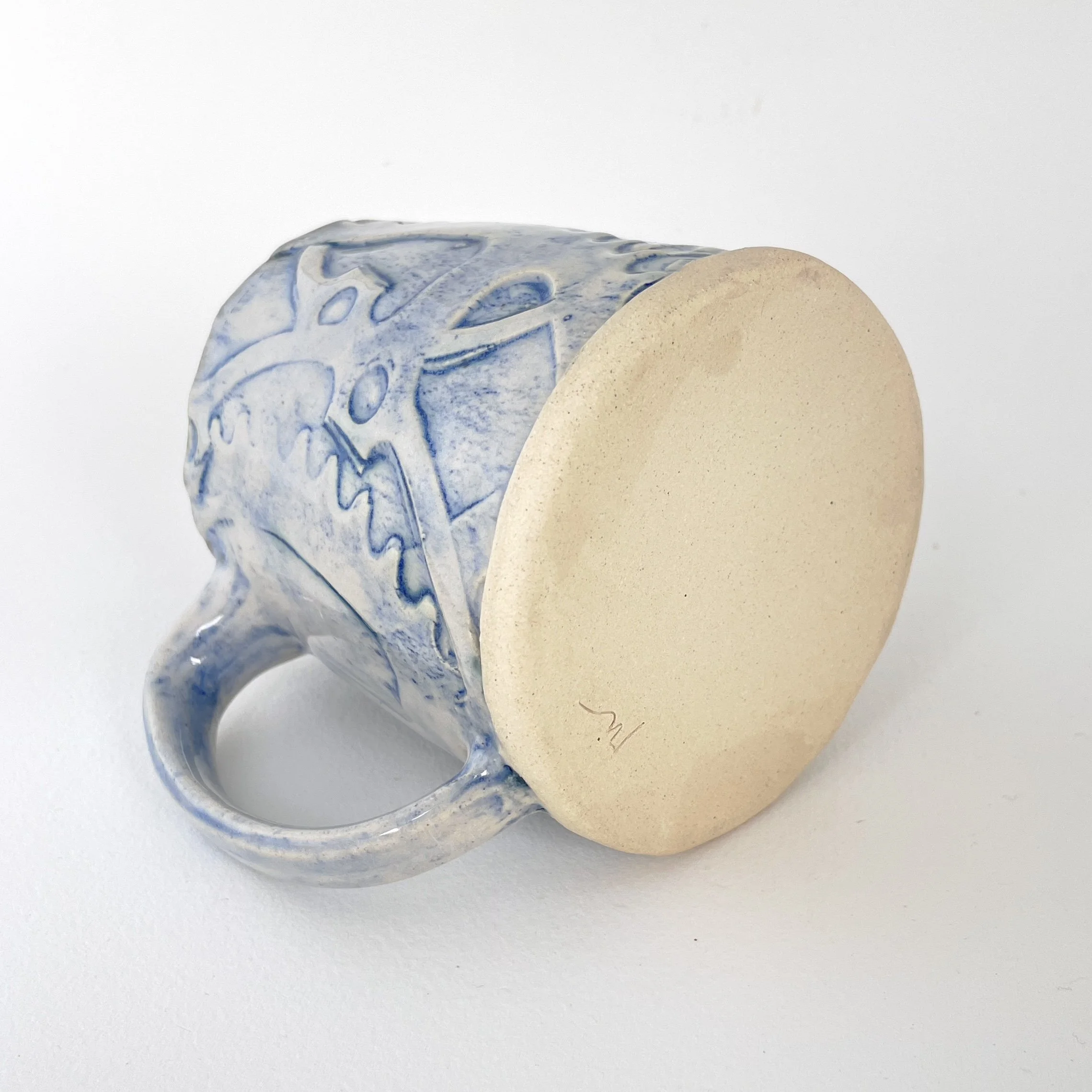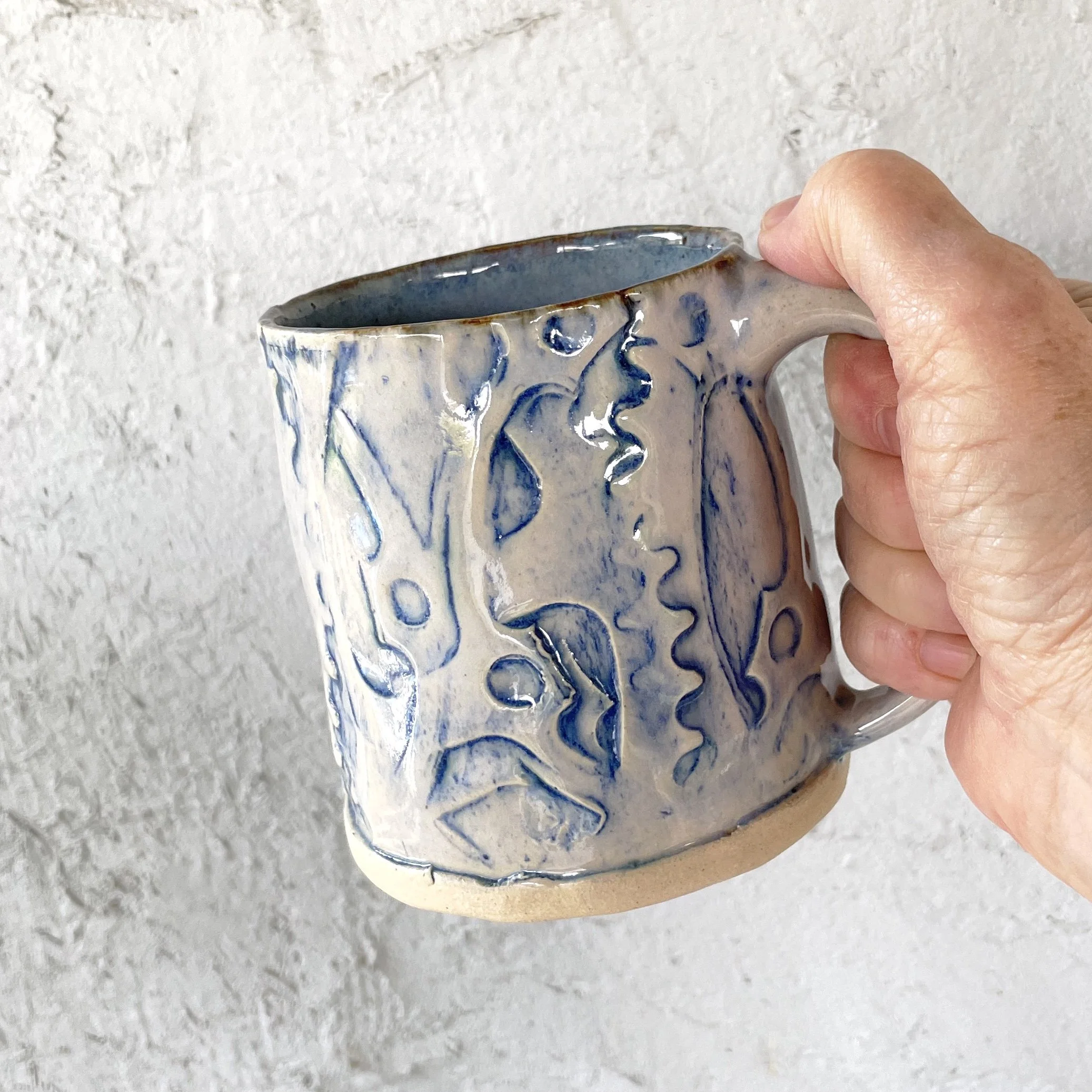 Handmade with both function and story, this ceramic mug carries the imprint of a bicycle flywheel, rolled into stoneware clay to create a striking, gear-like texture. Using a texture roller I crafted from a bike flywheel, I impressed the surface before forming a slab of clay into a mug, then finished it in a soft blue glaze. The impressions reveal the warmth of the clay beneath, highlighting the design with earthy contrast.
