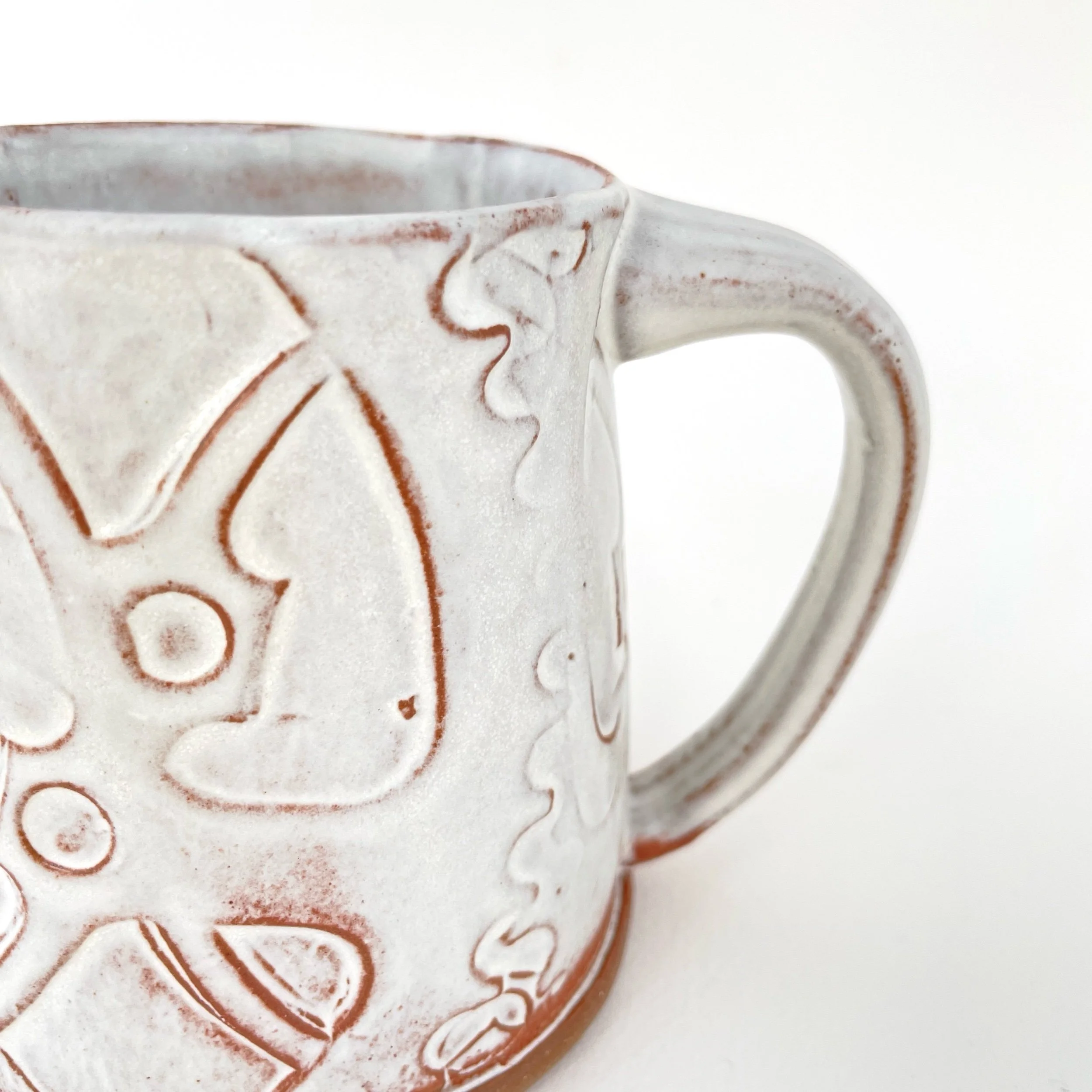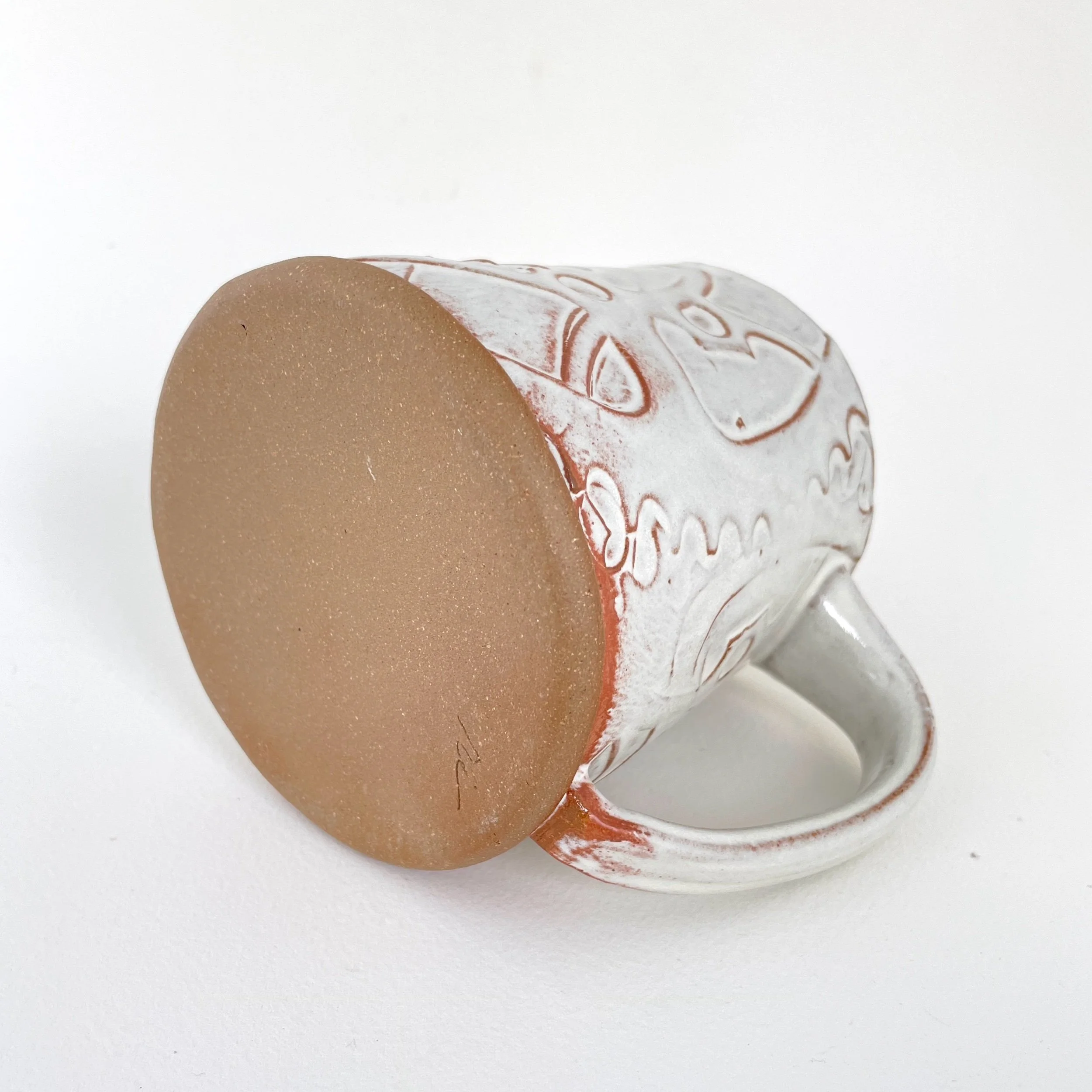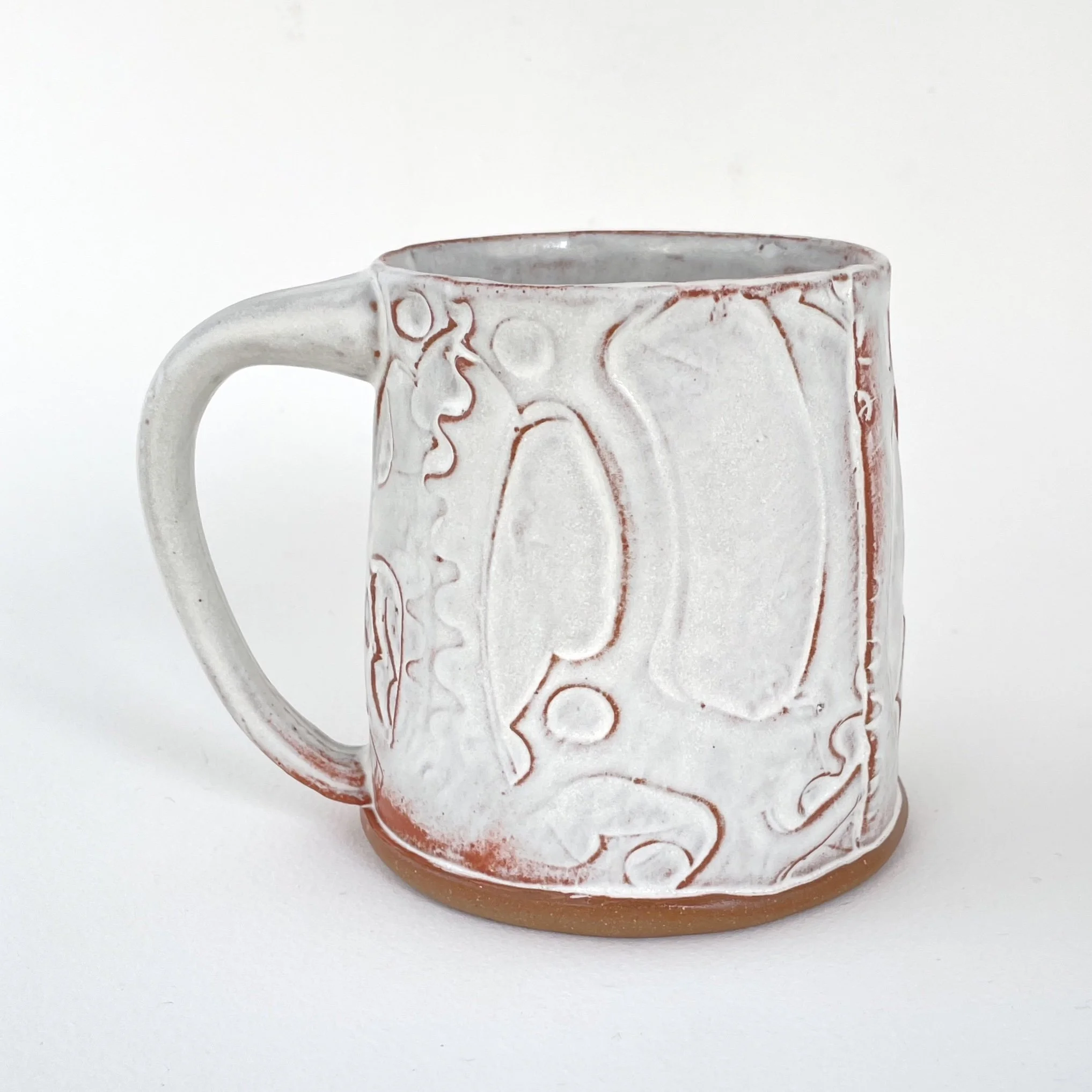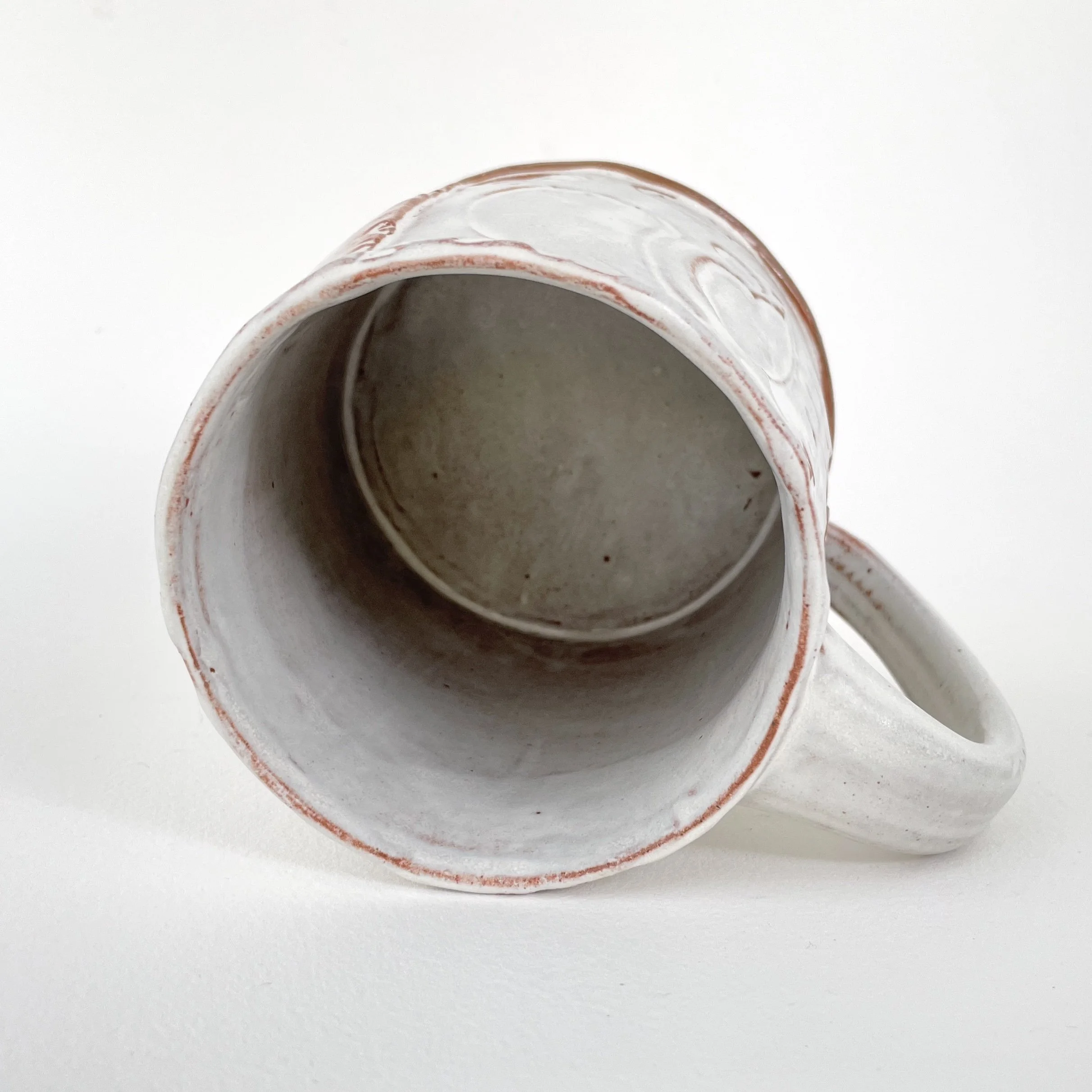 Handmade with both function and story, this ceramic mug carries the imprint of a bicycle flywheel, rolled into red clay to create a striking, gear-like texture. Using a texture roller I crafted from a bike flywheel, I impressed the surface before forming a slab of red clay into a mug, then finished it in a soft white glaze. The impressions reveal the warmth of the red clay beneath, highlighting the design with earthy contrast.