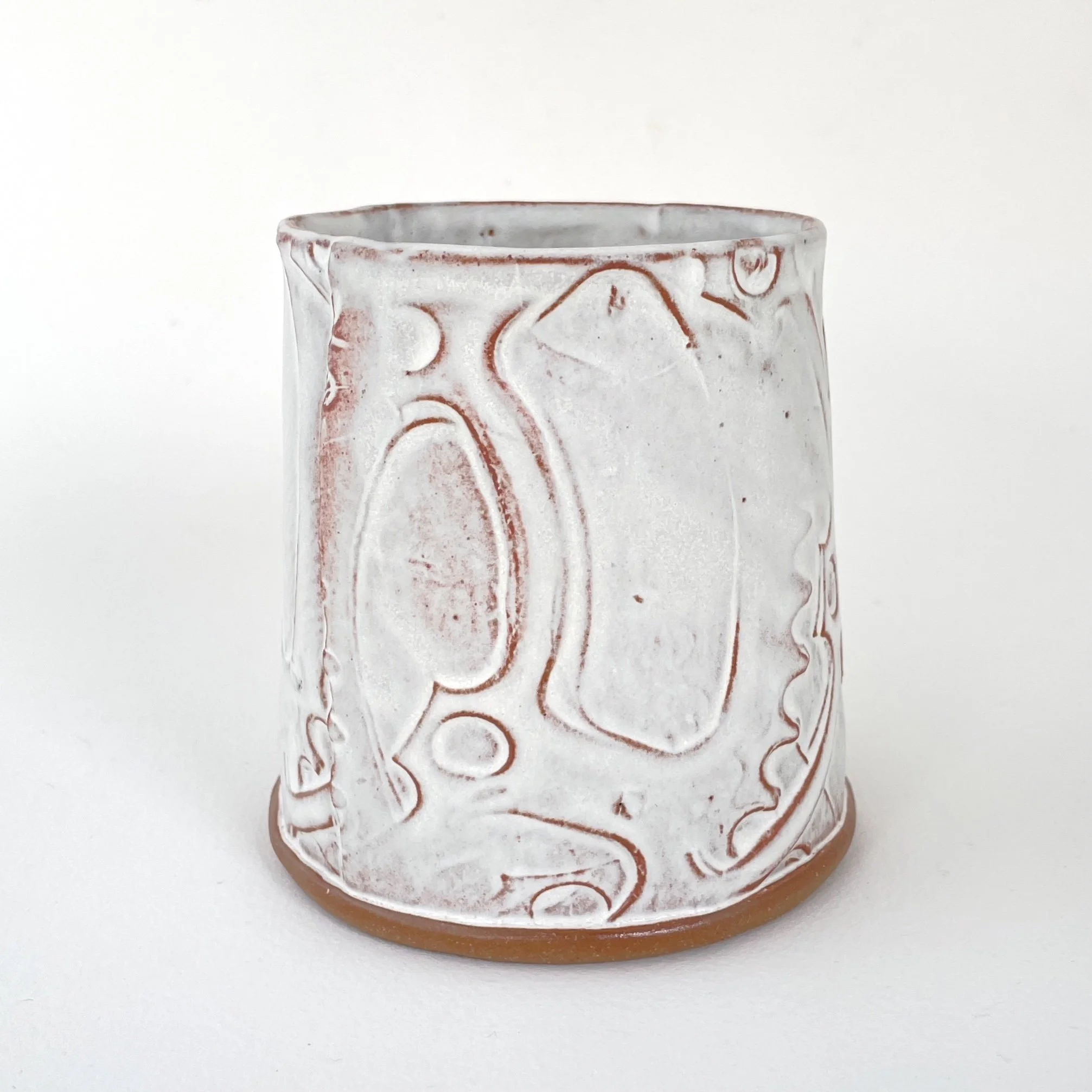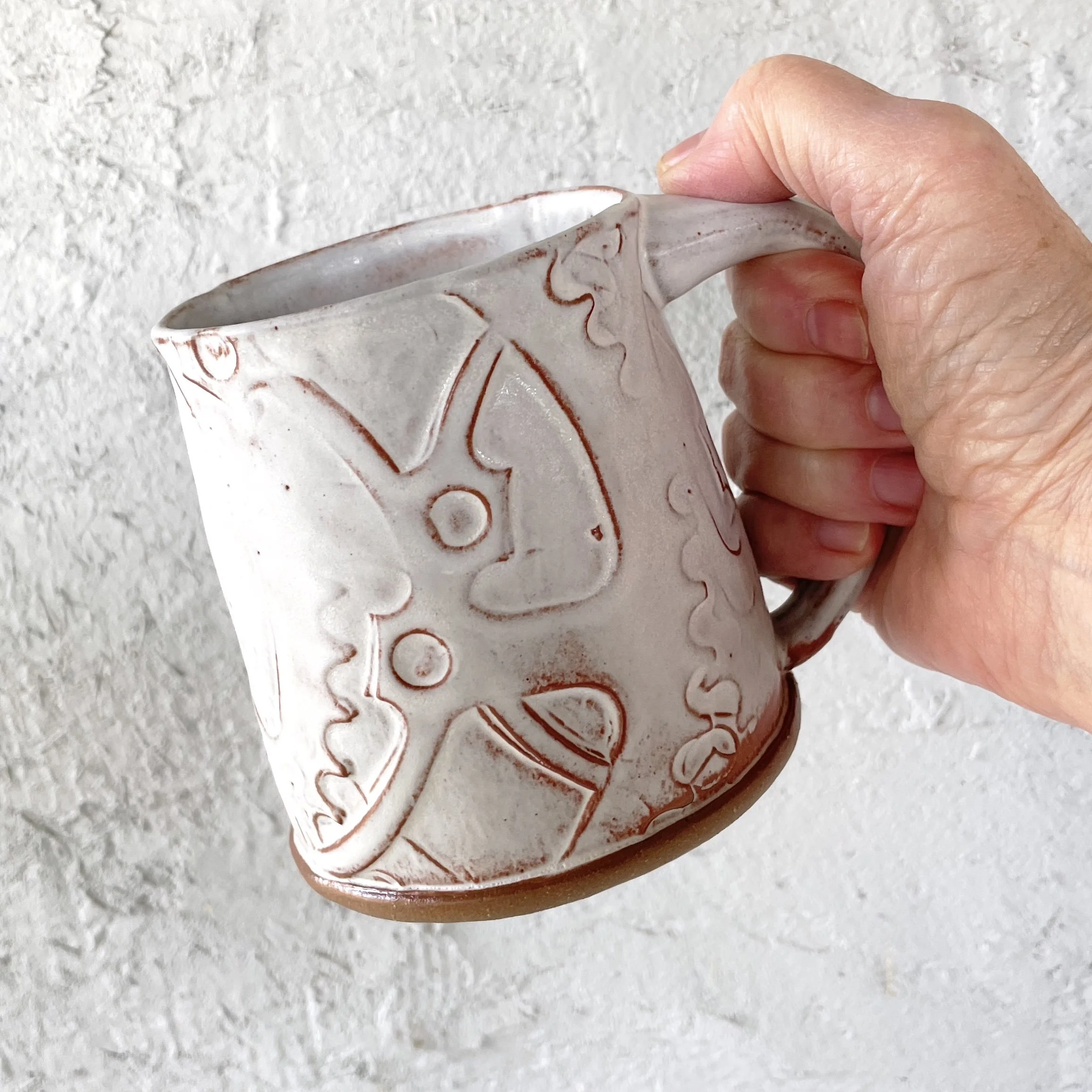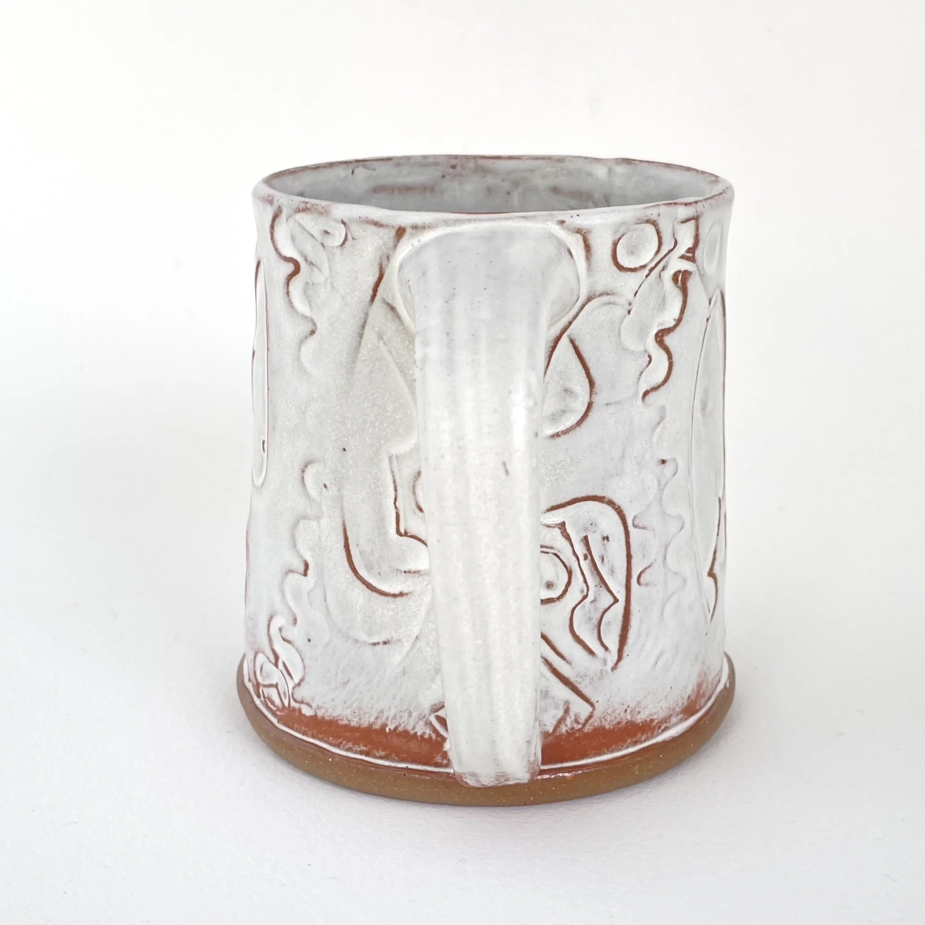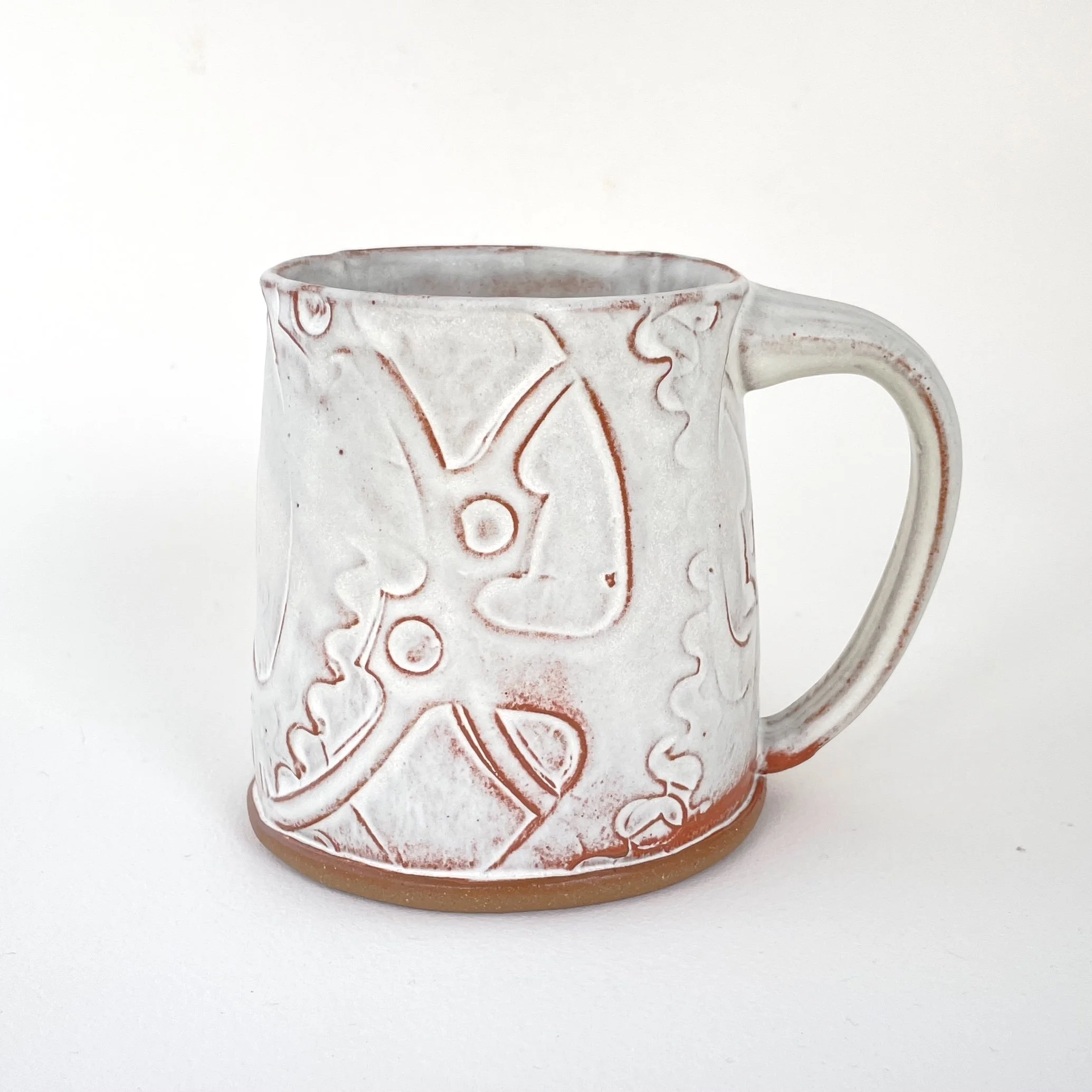 Handmade with both function and story, this ceramic mug carries the imprint of a bicycle flywheel, rolled into red clay to create a striking, gear-like texture. Using a texture roller I crafted from a bike flywheel, I impressed the surface before forming a slab of red clay into a mug, then finished it in a soft white glaze. The impressions reveal the warmth of the red clay beneath, highlighting the design with earthy contrast.