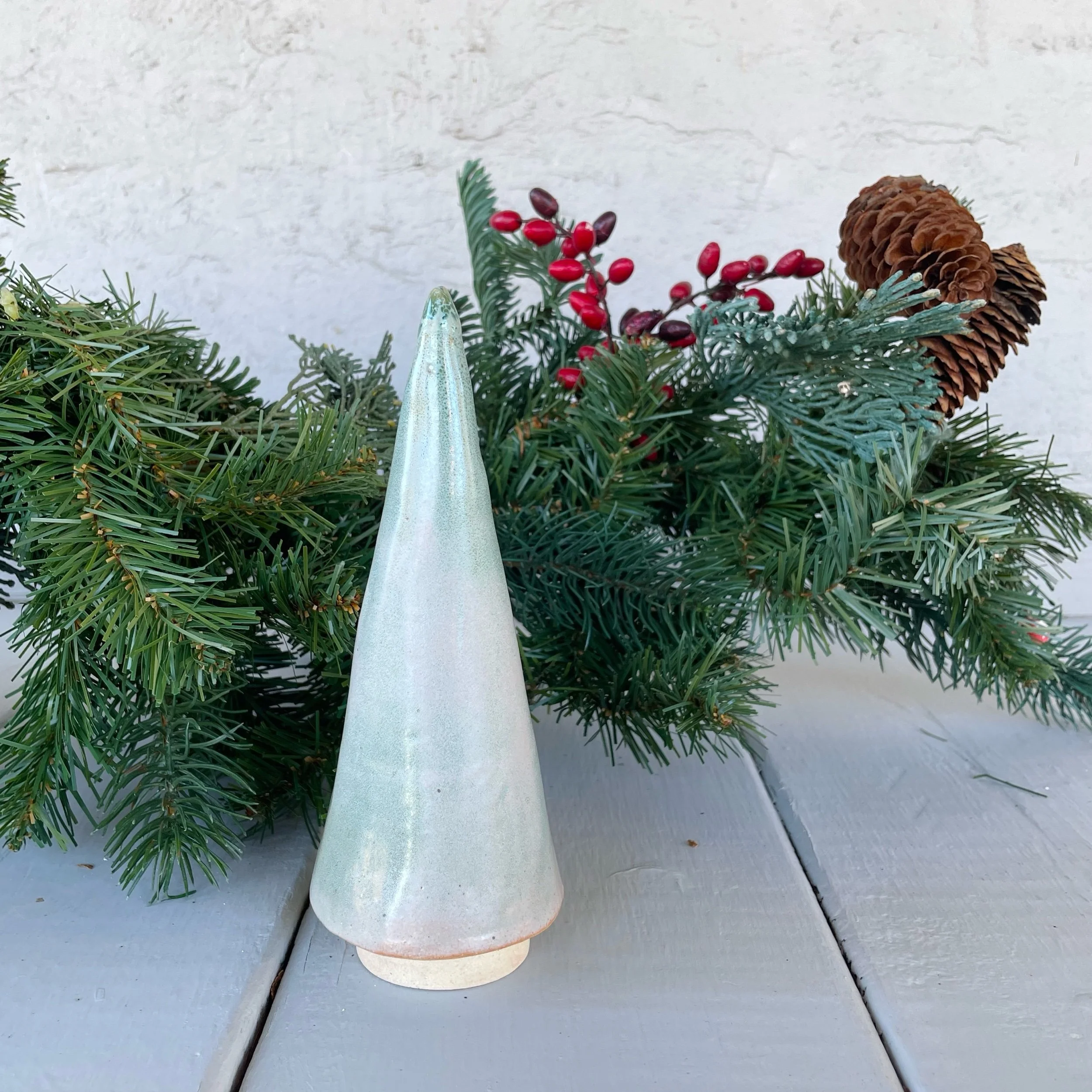 A quietly sculptural ceramic tree, shaped by hand and finished with a soft, pale green glaze. Each piece carries subtle variations in form and surface—small shifts that reveal the touch of the maker and lend every tree its own character.