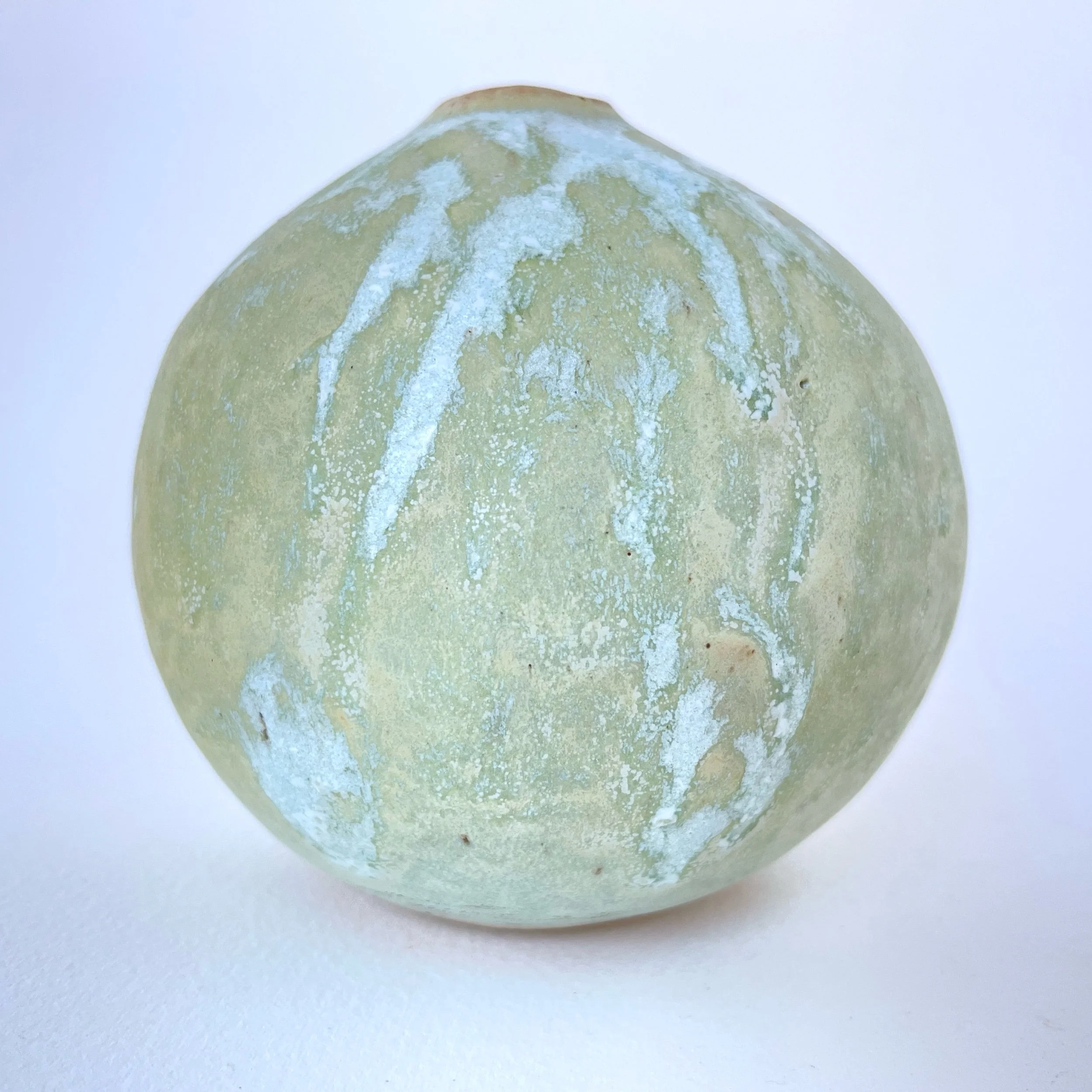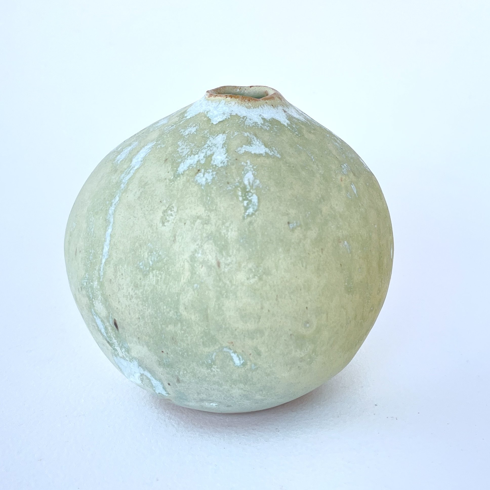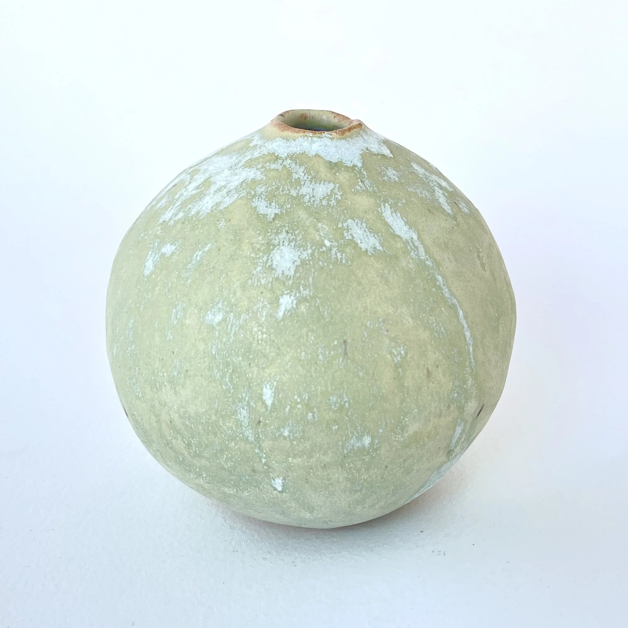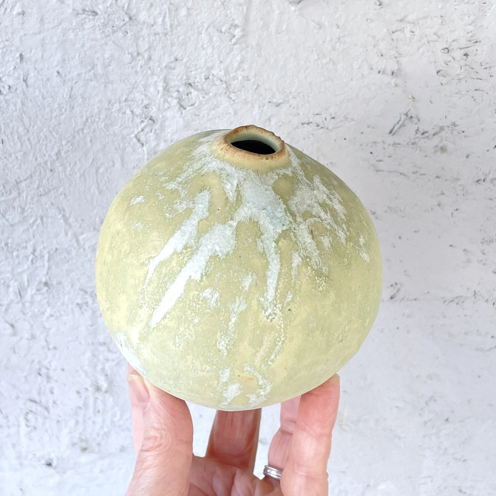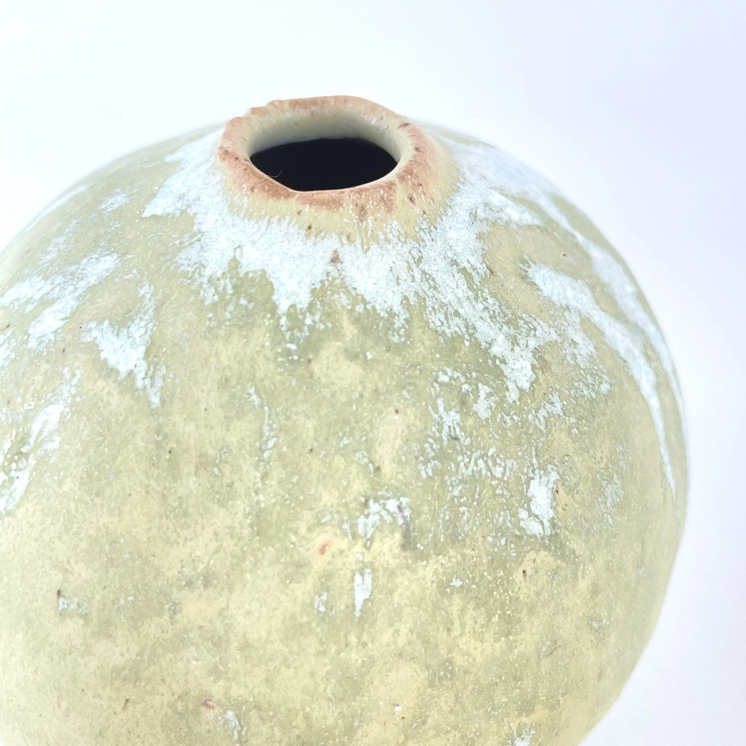 A delicate, hand-built ceramic orb vase that embodies the organic beauty of imperfection. With a soft, natural yellow glaze that hints of green, and subtle white drips cascading over its surface, this small vessel reflects natural textures, fluidity, and quiet elegance.