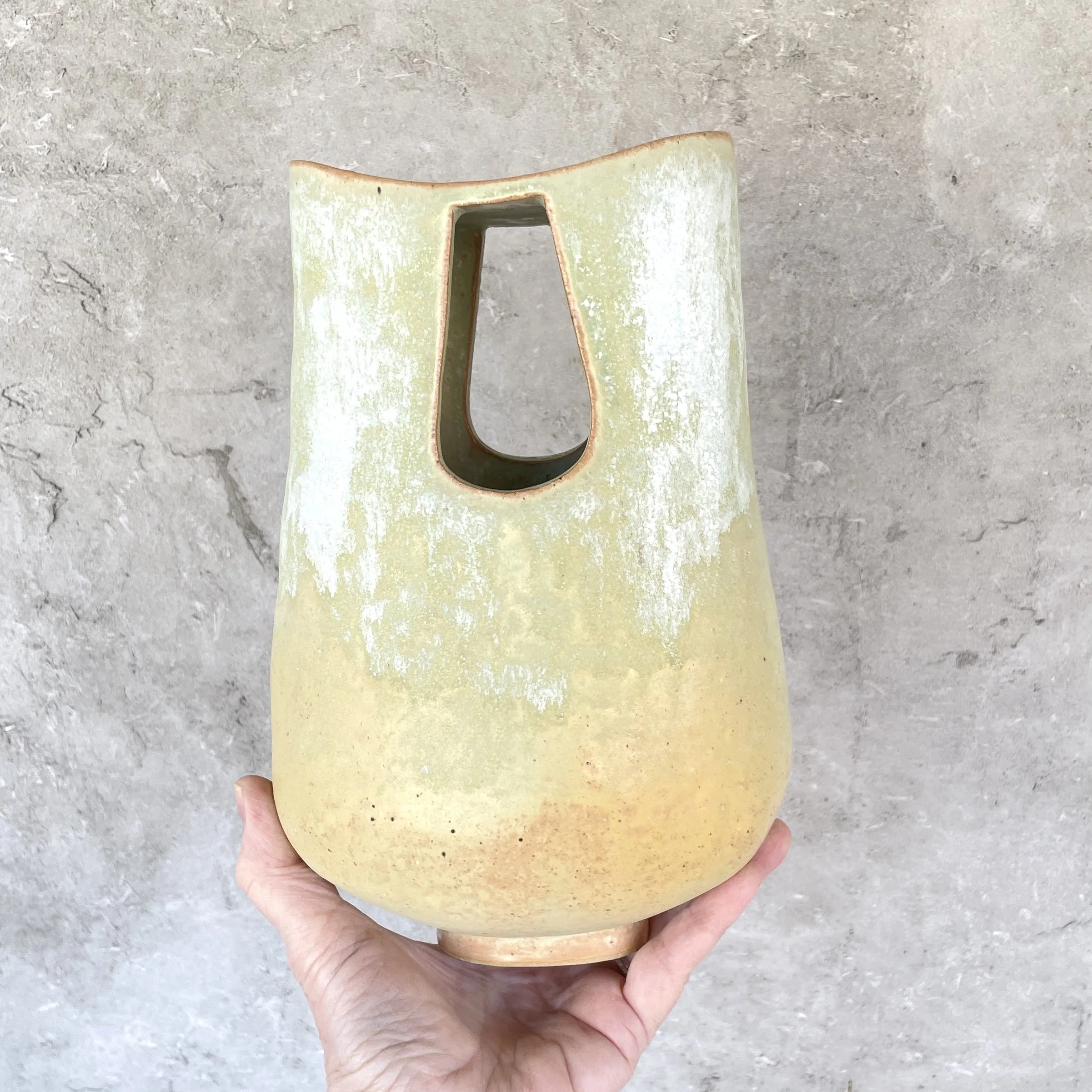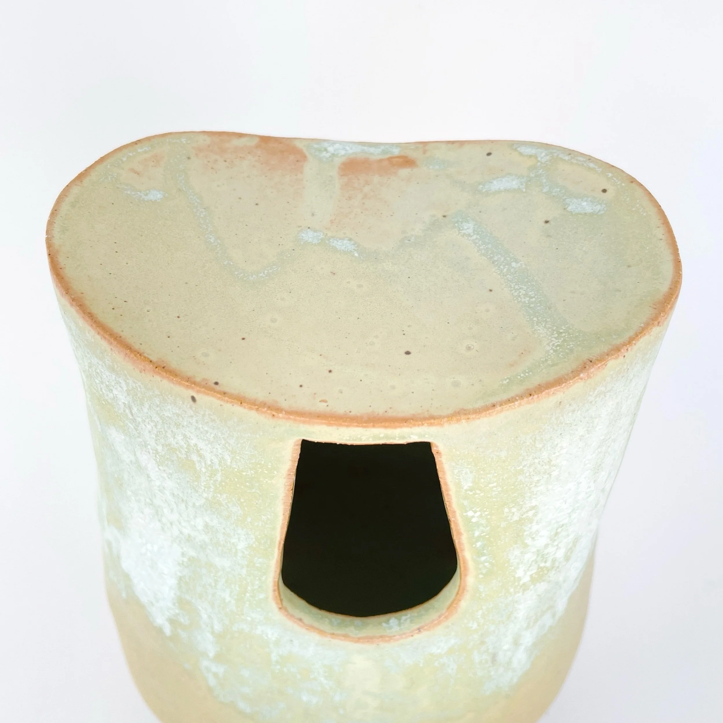 Listening Vestige reflects the quiet dialogue between form and emptiness. Hand-built with a soft, rounded silhouette, the piece is shaped around a slender, elongated opening that acts as both a threshold and a pause—a place where light gathers and a sense of listening presence emerges through what is not there.