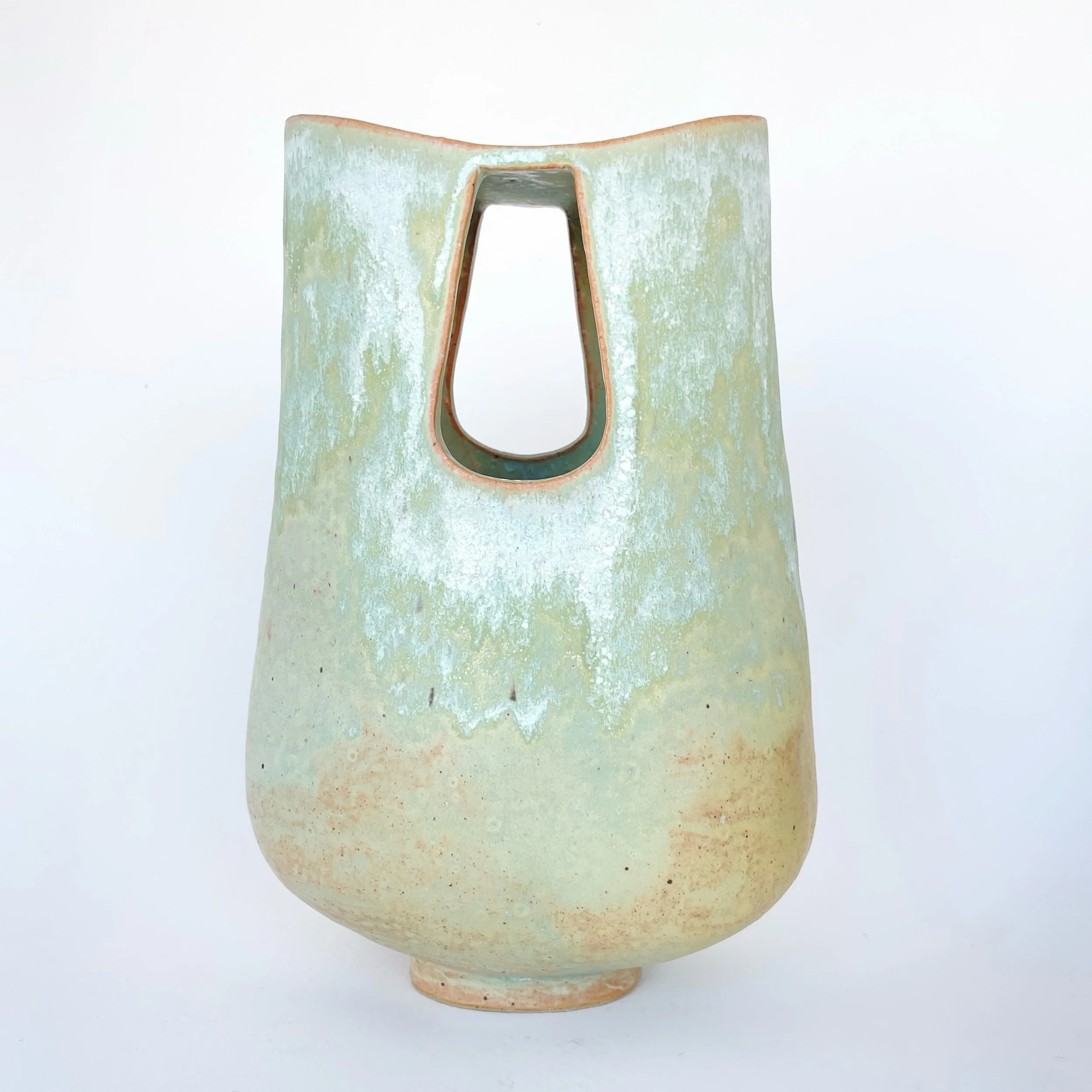 Material: Handbuilt stoneware with pale green, ochre and crystalline white glaze