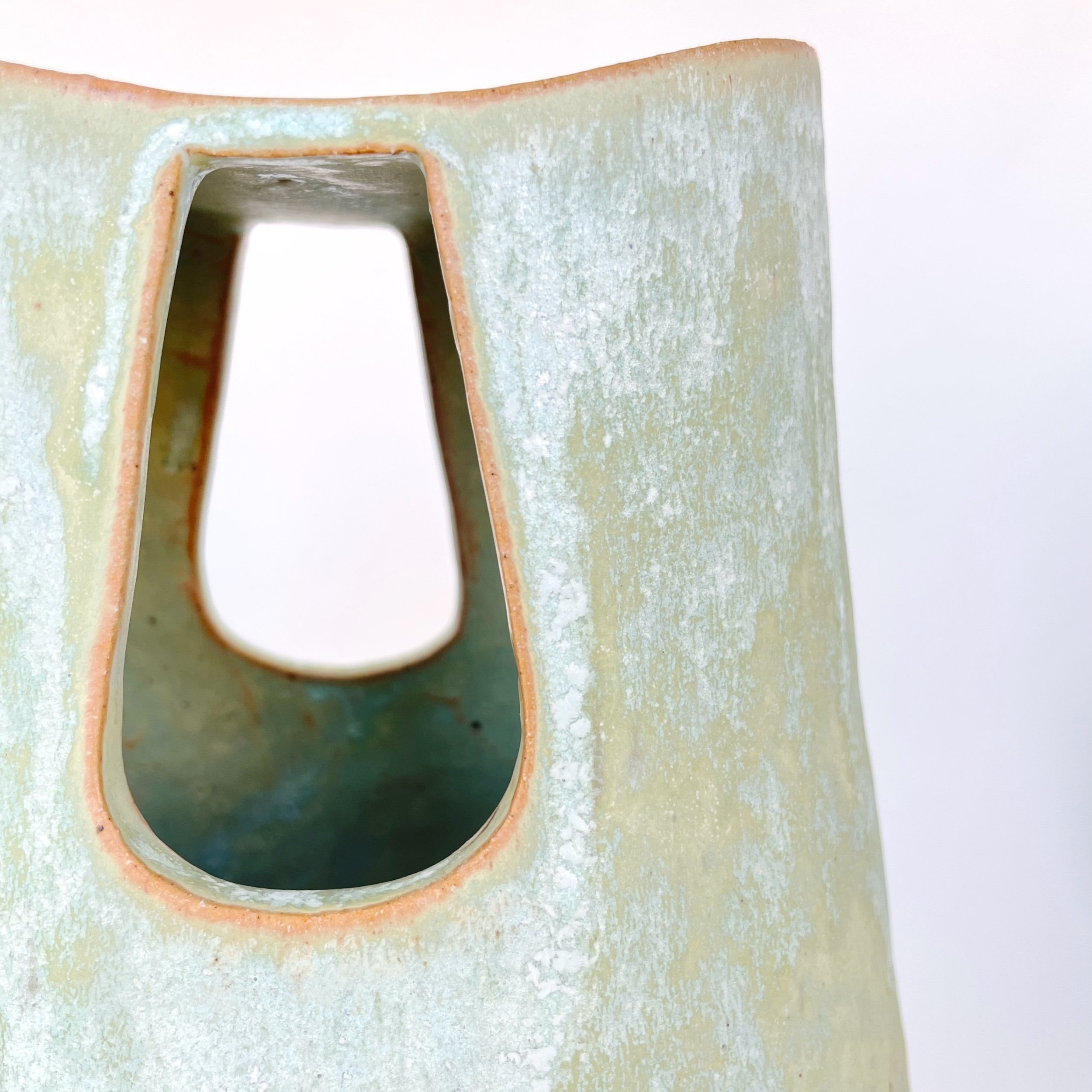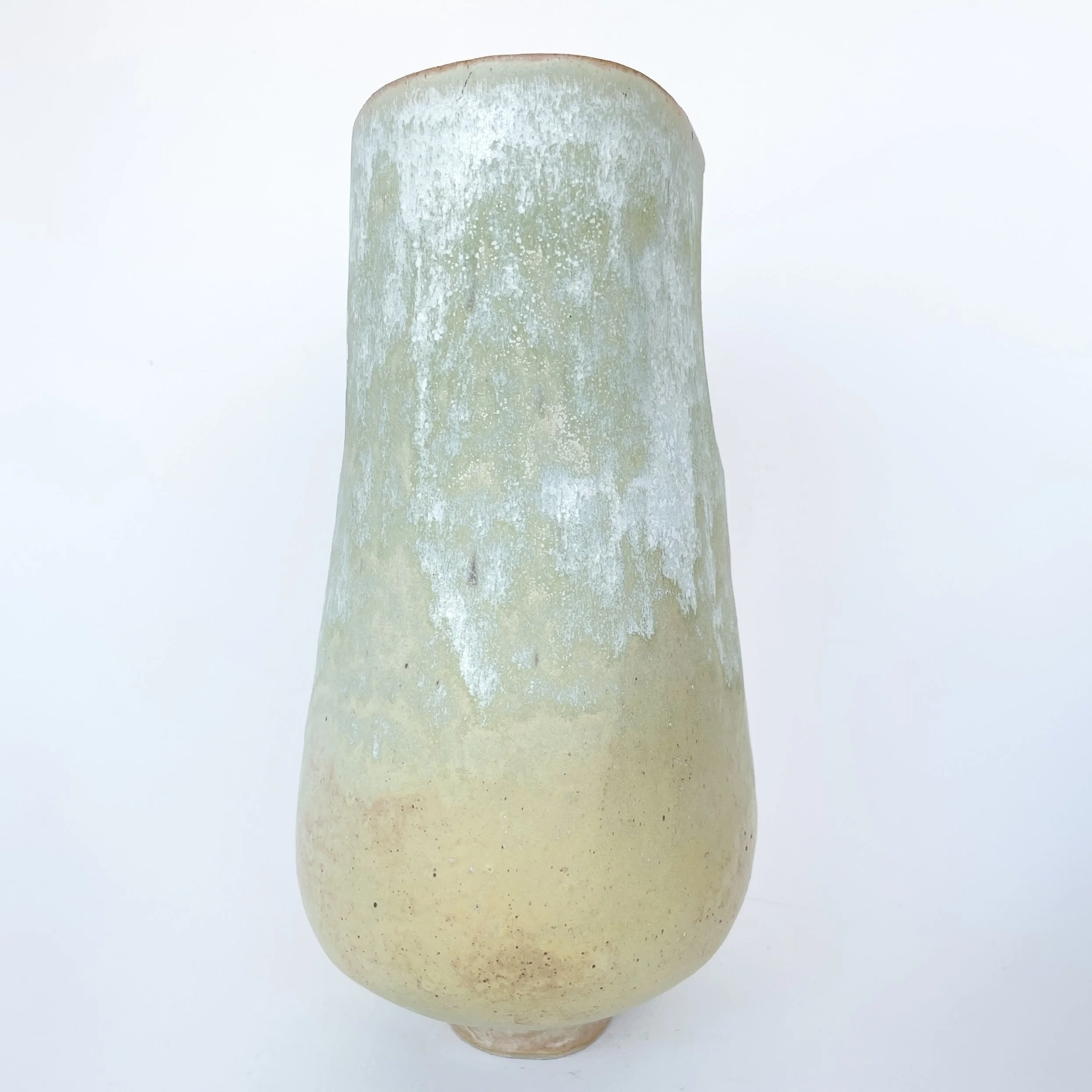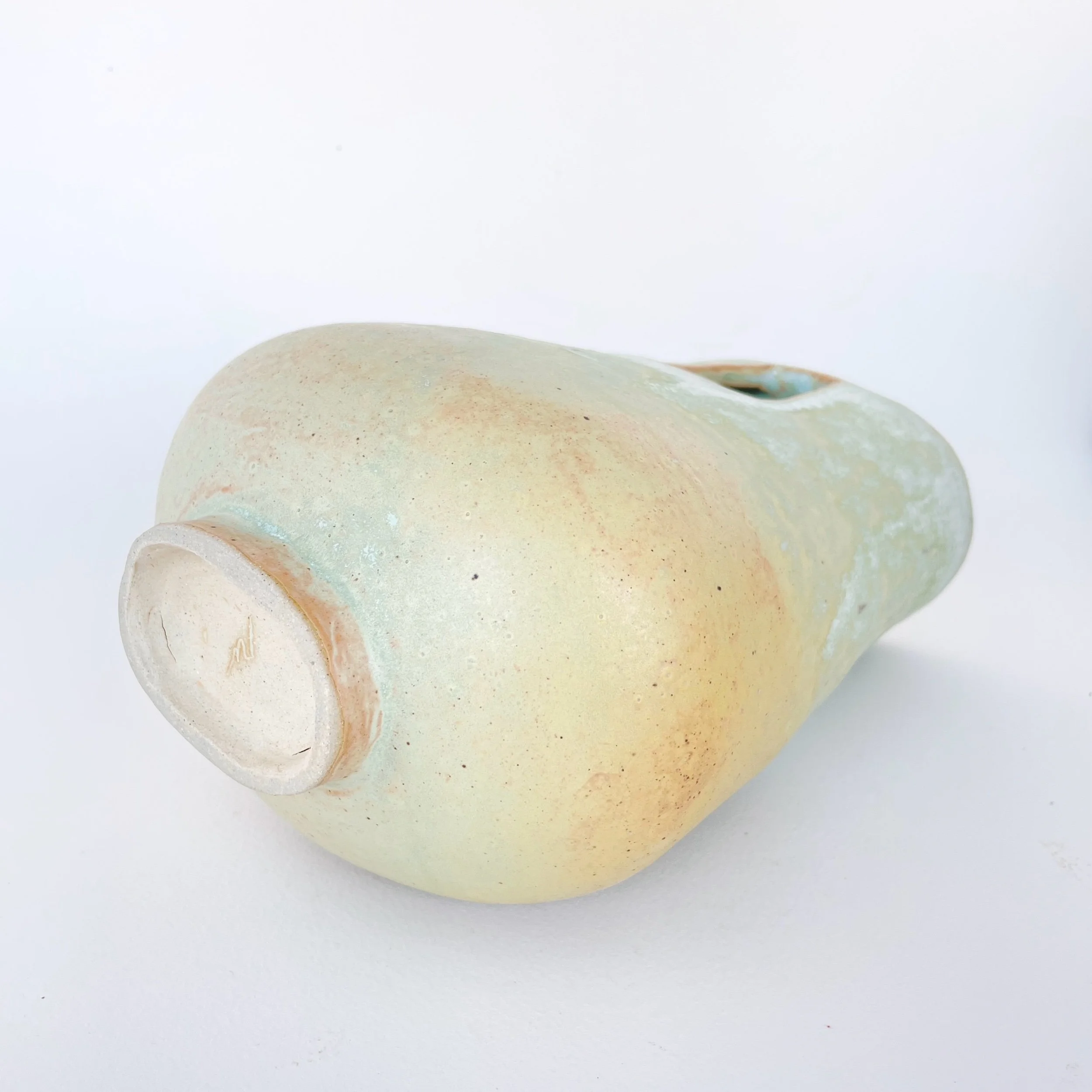 Shifting gently between pale greens, warm ochres, and softened whites, the surface echos the weathered textures of time-worn stone or fading memory. Subtle variations in the glaze create a sense of depth and stillness, inviting a pause for looking. The footed bottom lifts the vessel off the surface and helps define the form.
