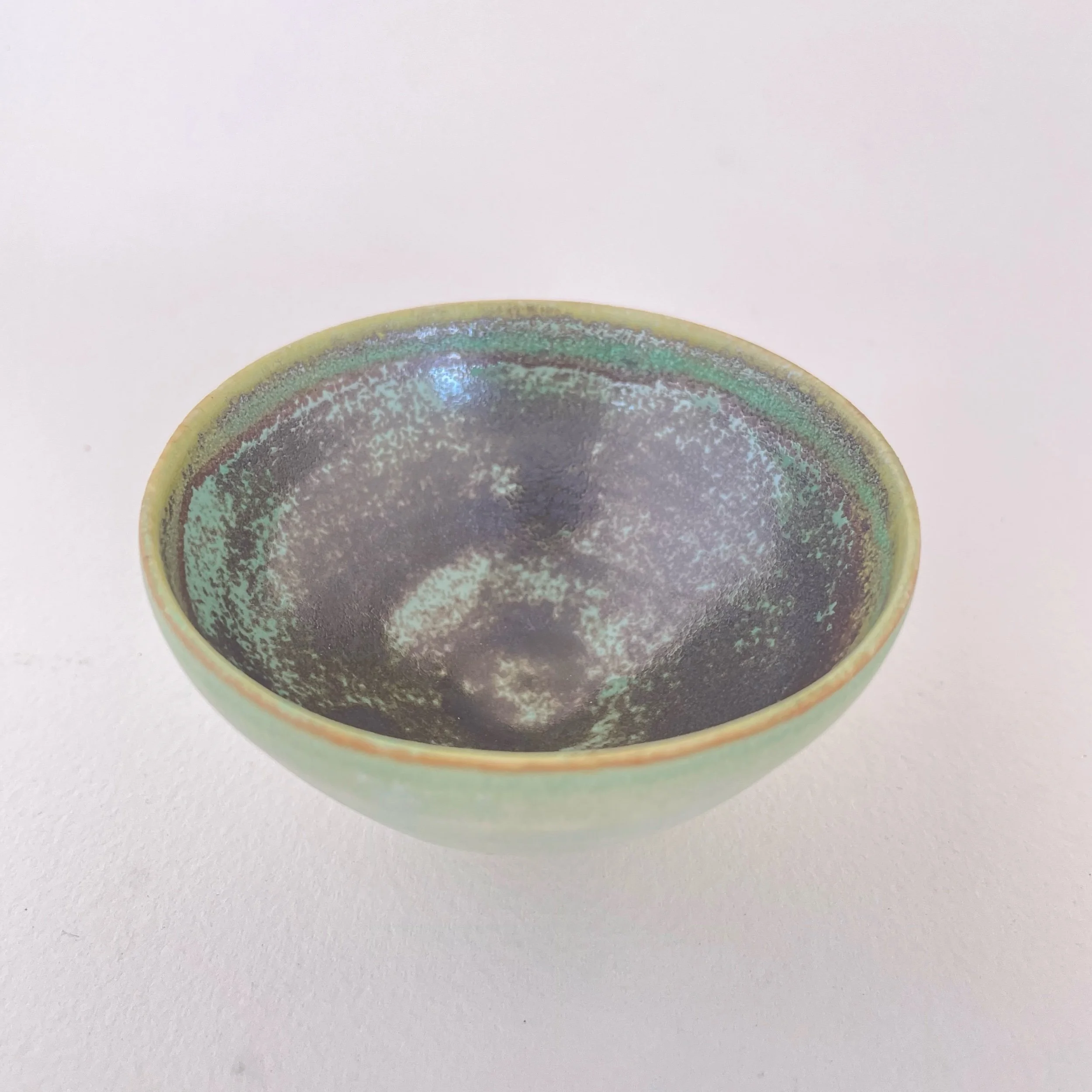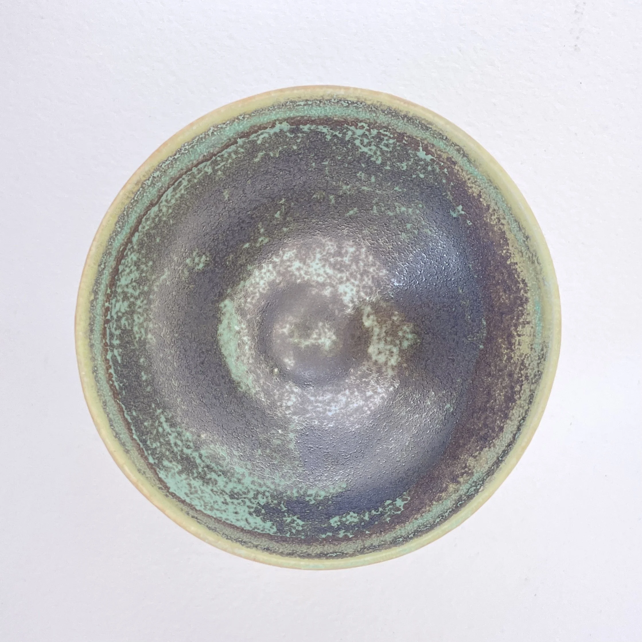 Inside, the glaze deepens into a rich, atmospheric mix of dark olive, sea-green, and earthy bronze tones. The layered, speckled surface creates a sense of depth and movement, as if looking into a small landscape or tidepool.