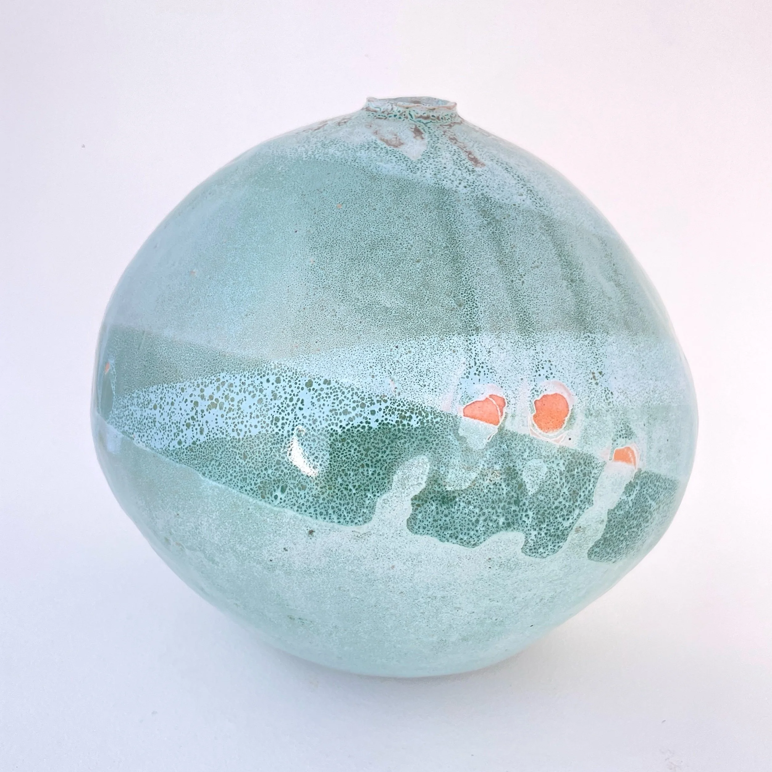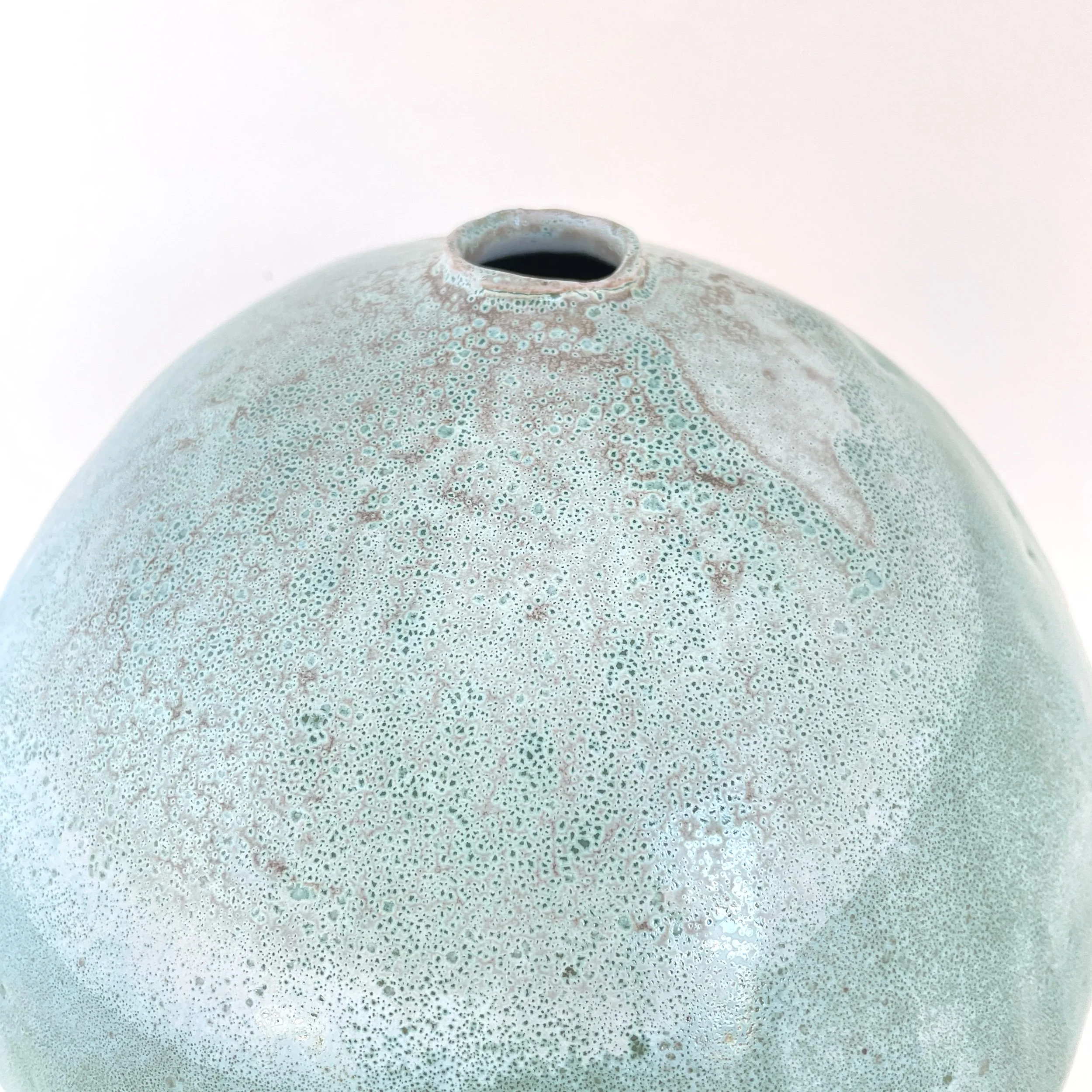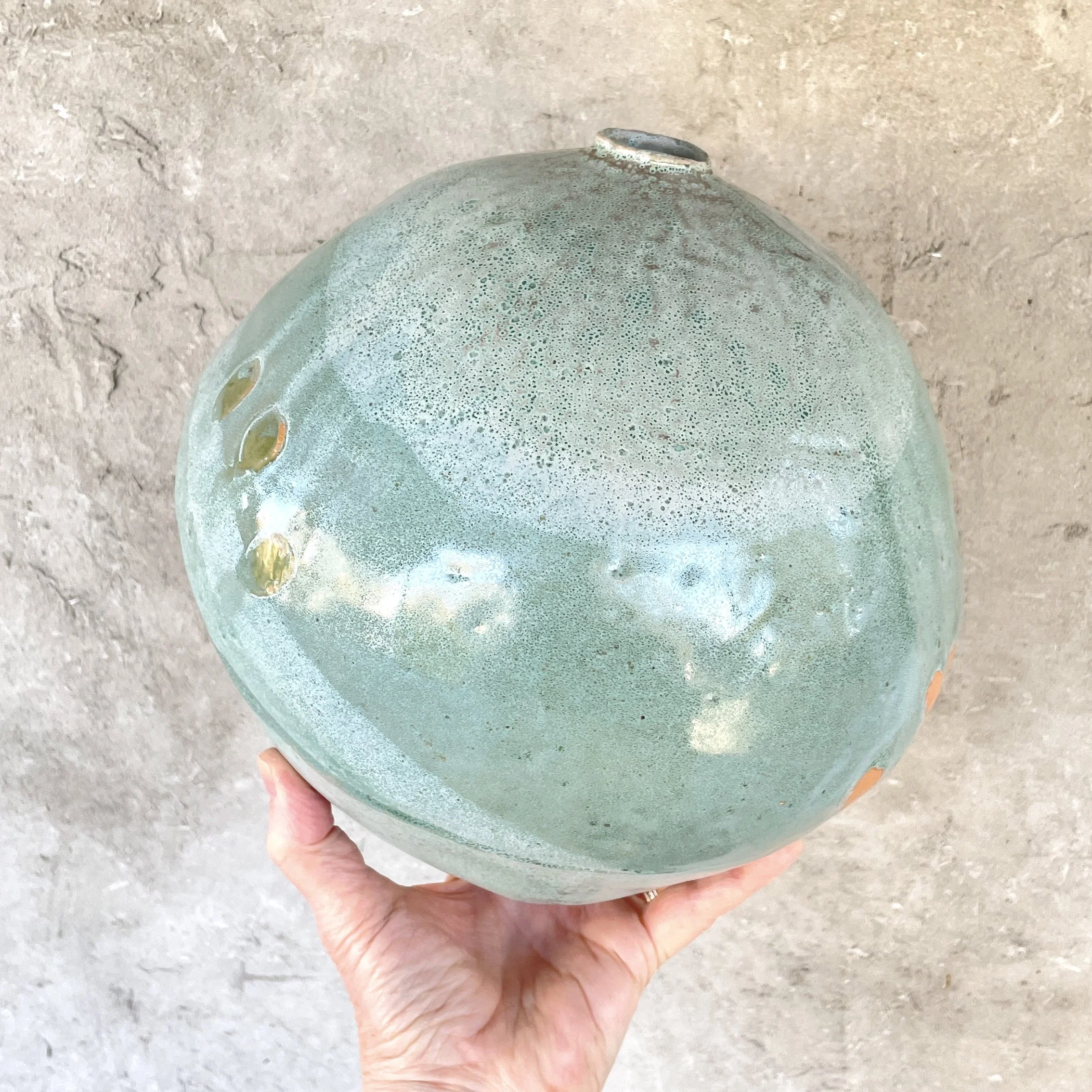 A large hand-built ceramic orb with a soft green glaze that shifts between misty turquoise and pale celadon. Subtle variations in tone and texture echo coastal greens touched by light. Handcrafted with thought and intention, its sculptural presence is perfect for showcasing floral arrangements or as a standalone art piece.