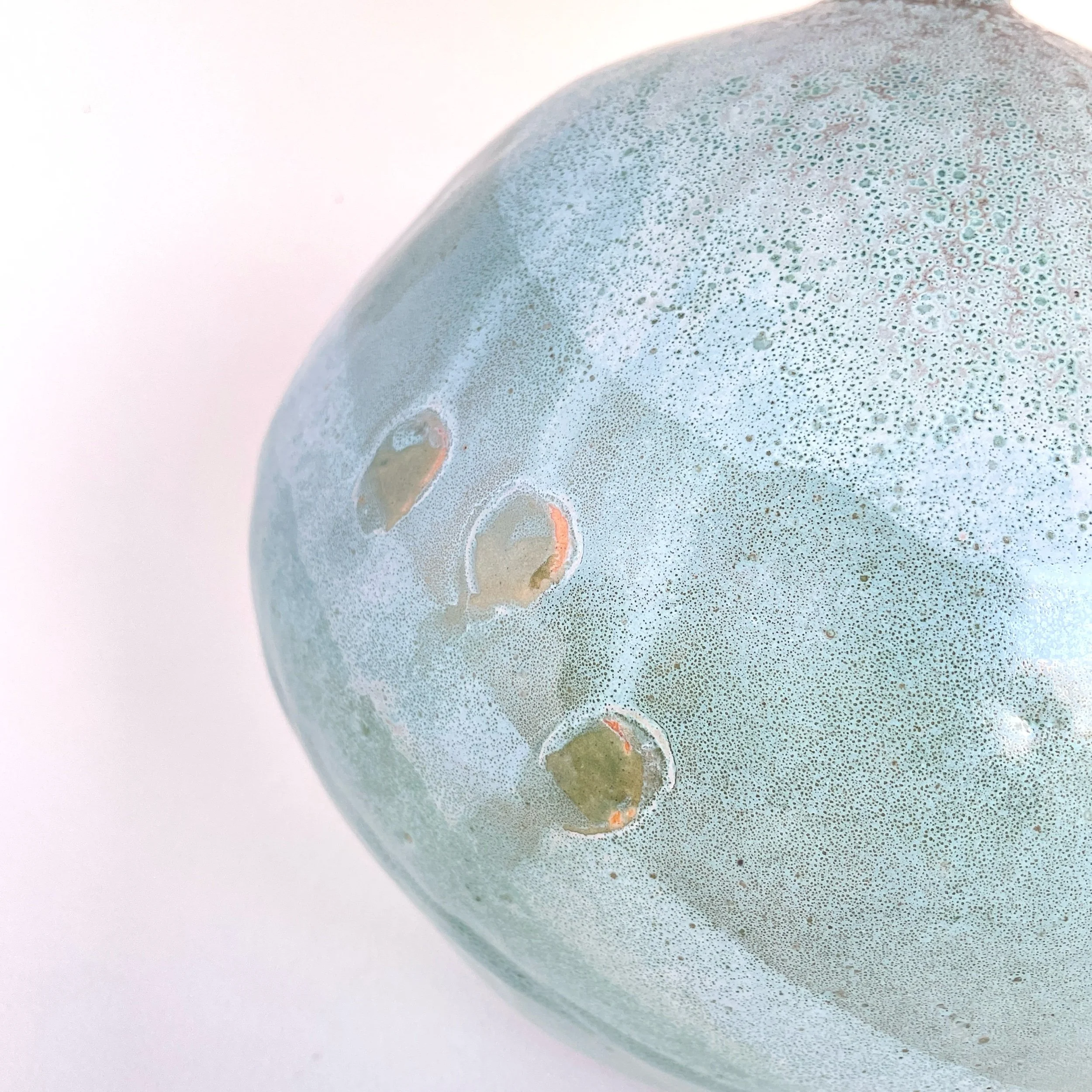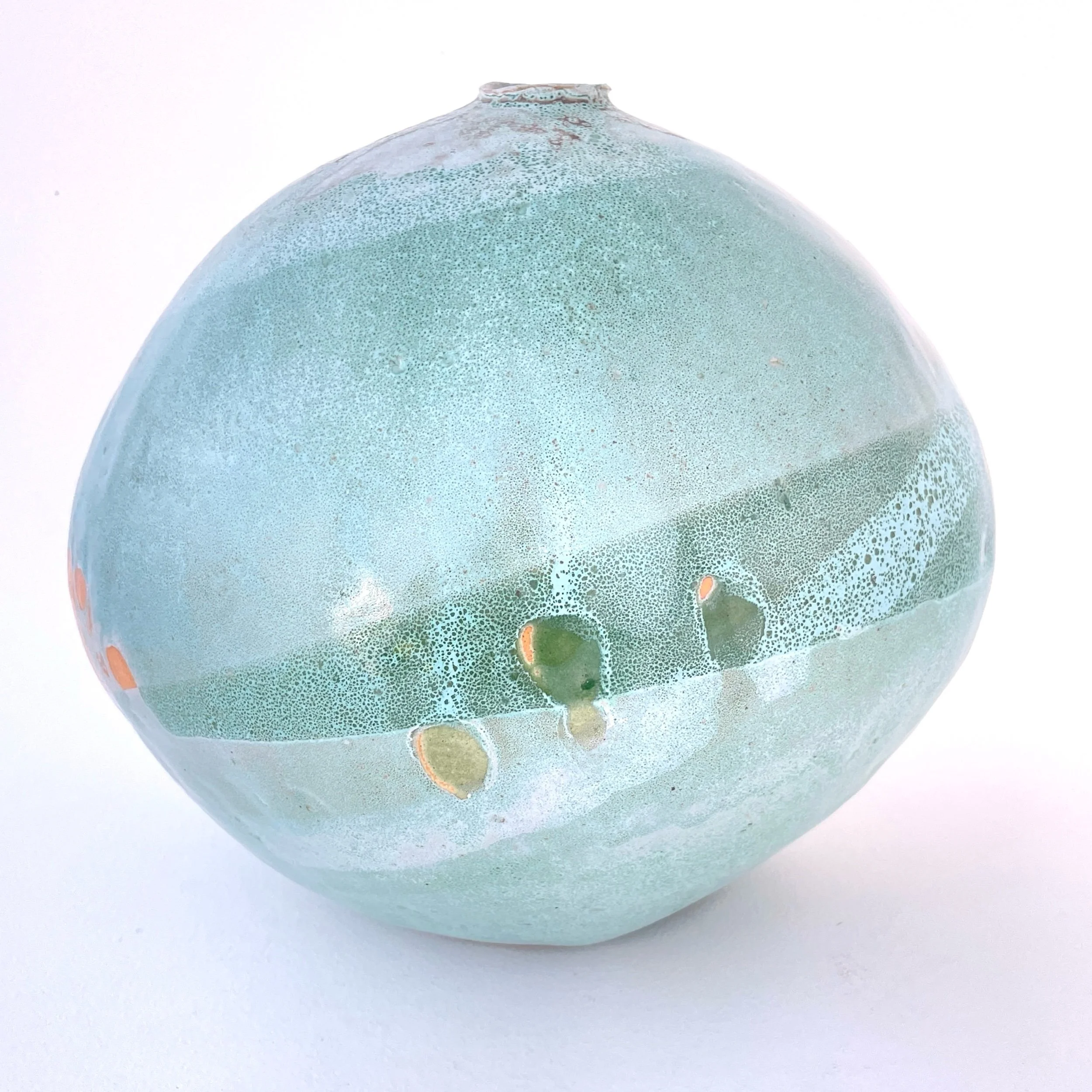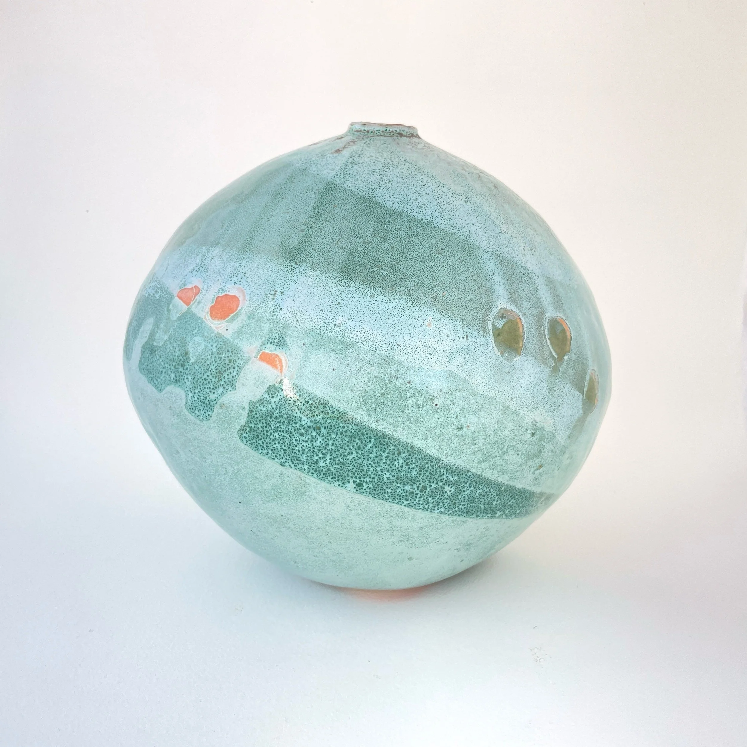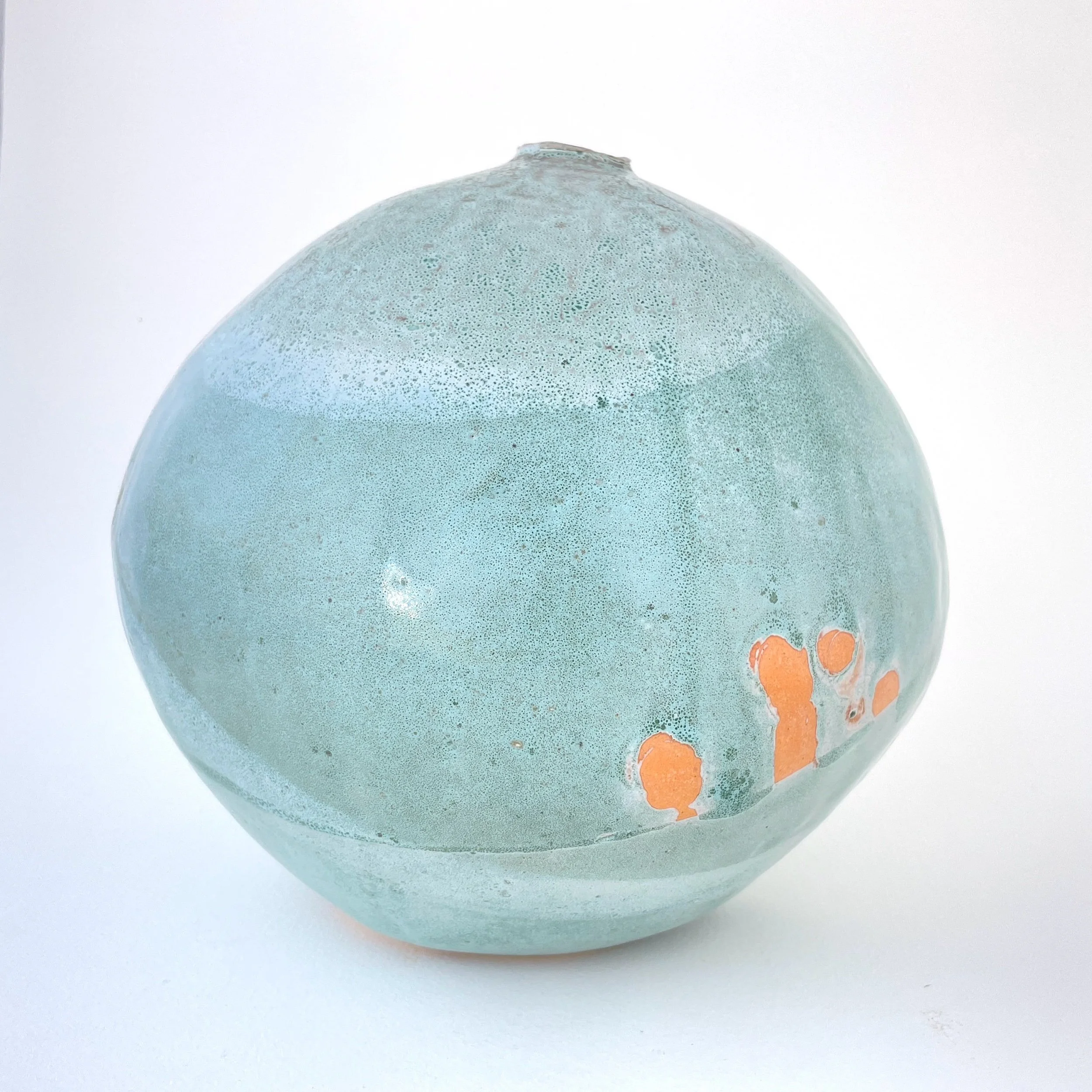 A large hand-built ceramic orb with a soft green glaze that shifts between misty turquoise and pale celadon. Subtle variations in tone and texture echo coastal greens touched by light. Handcrafted with thought and intention, its sculptural presence is perfect for showcasing floral arrangements or as a standalone art piece.