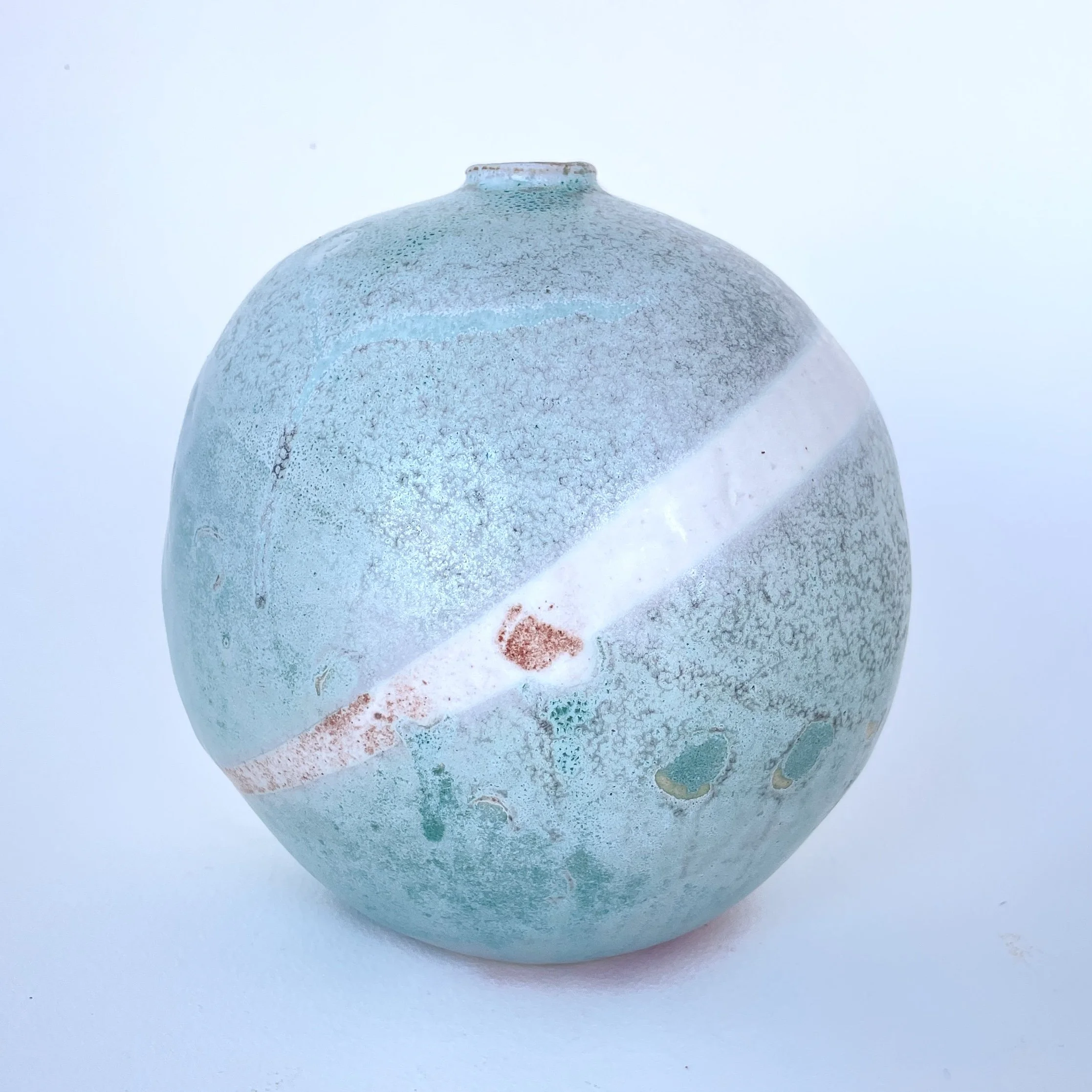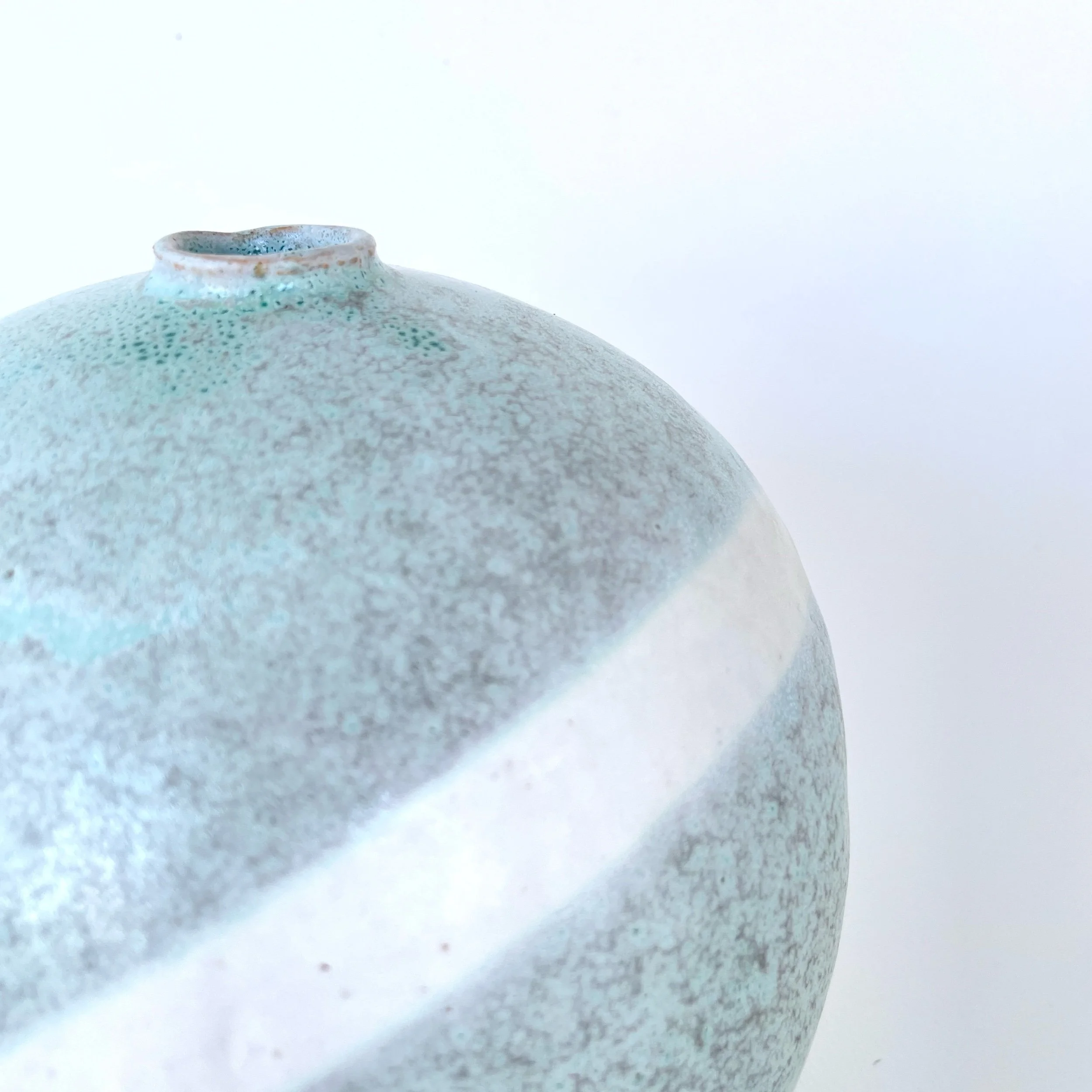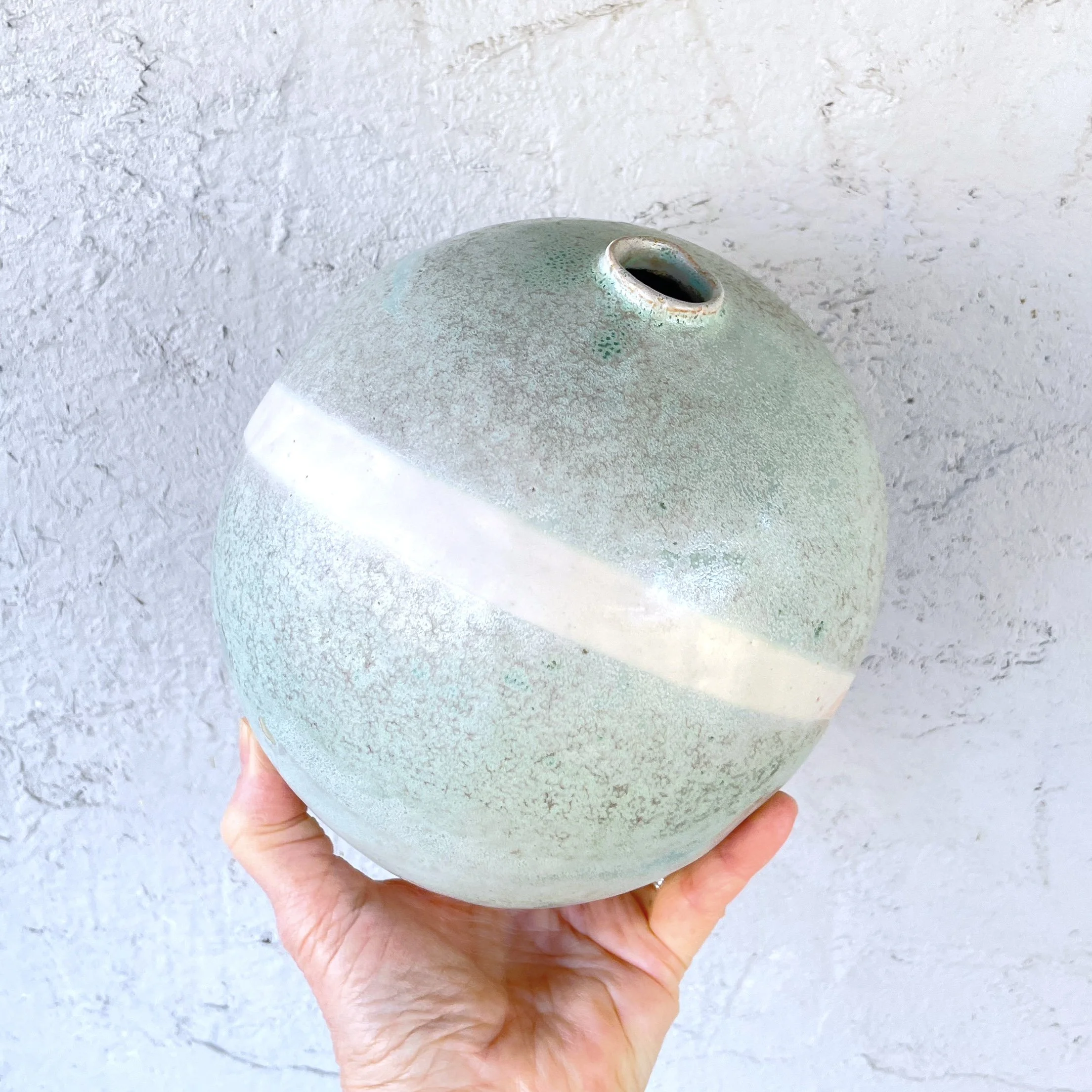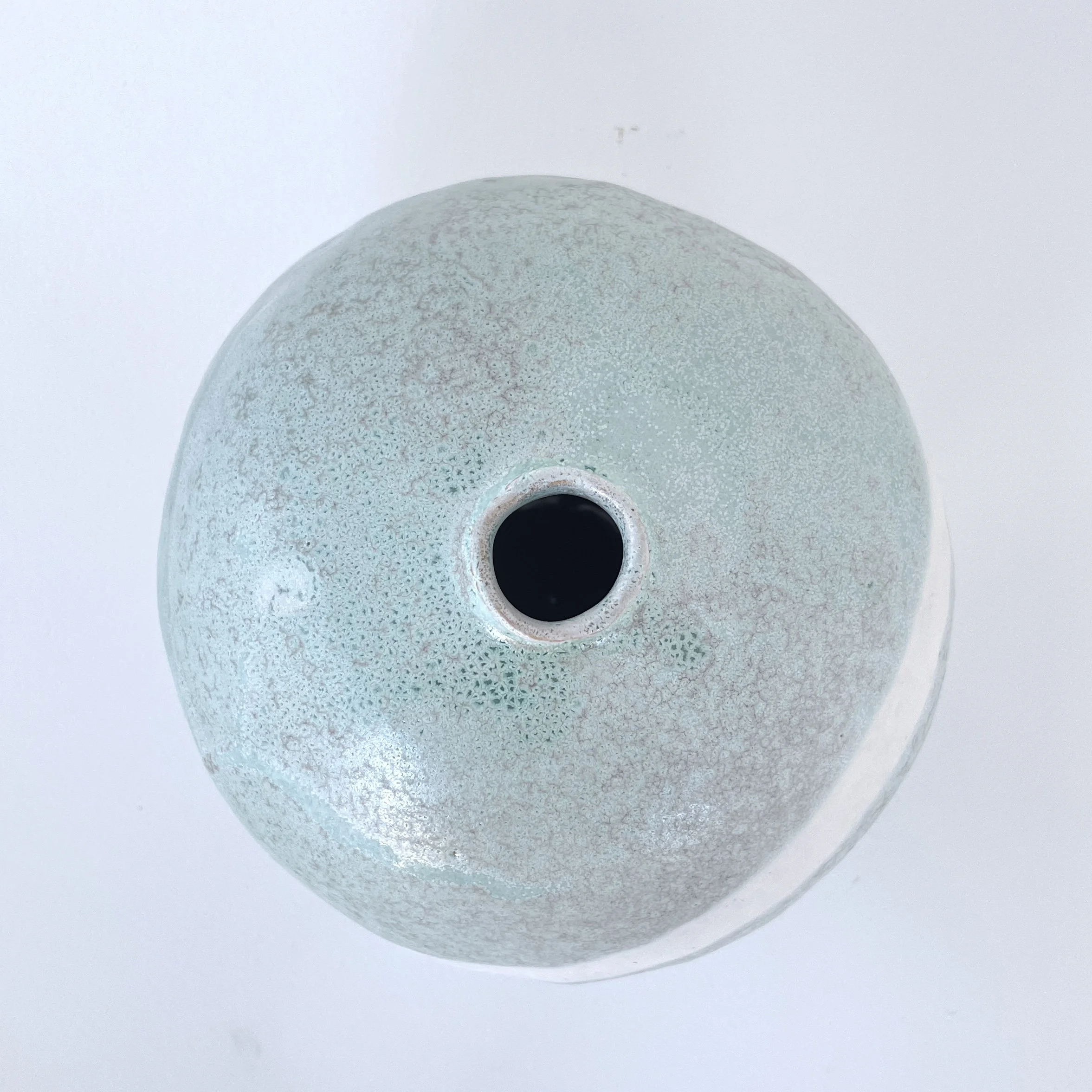 This hand-built orb features a serene palette of misted celadon and pale mineral greens, interrupted by a quiet, snowy band that drifts gently around the form. The surface carries delicate, organic speckling and subtle tonal shifts that invite close looking.