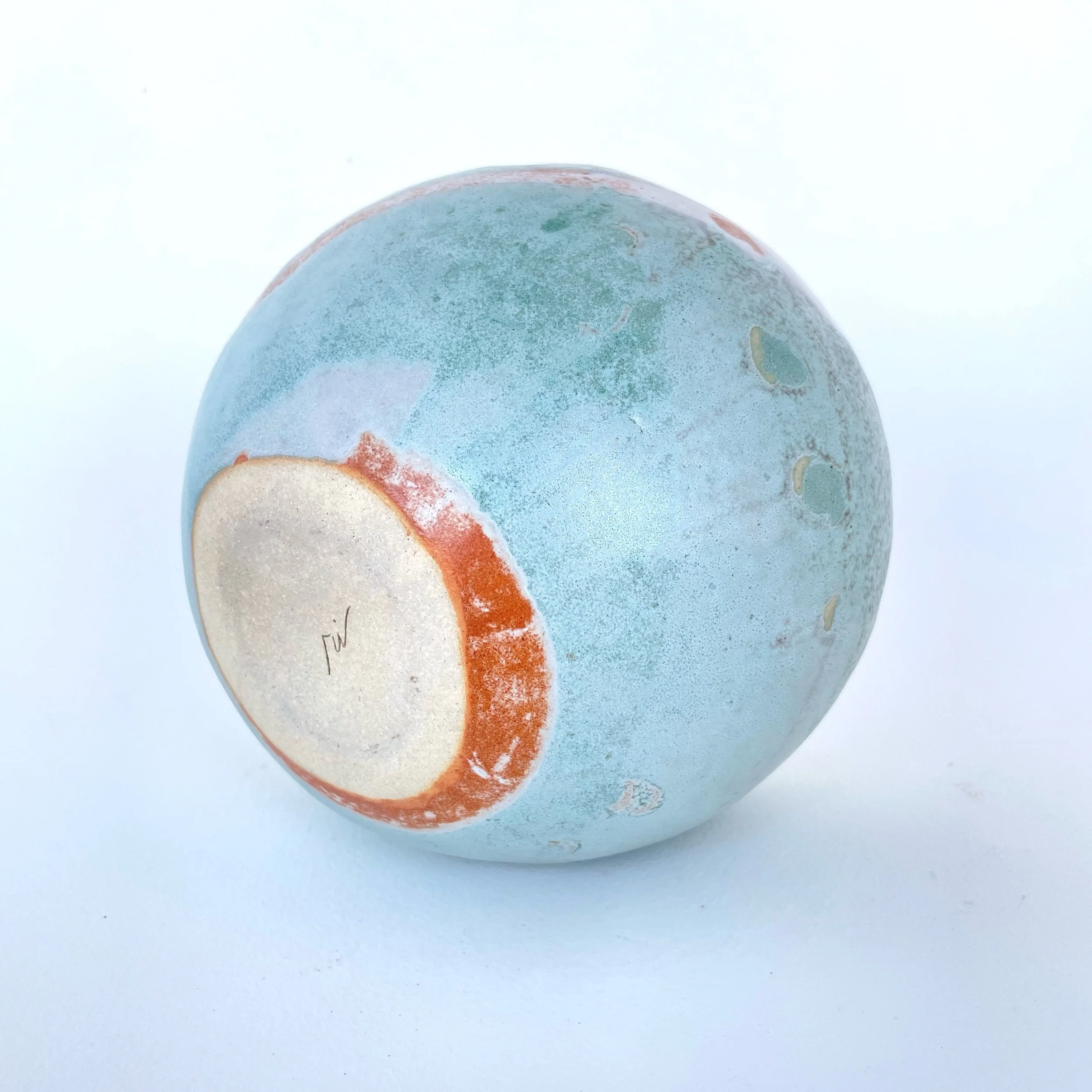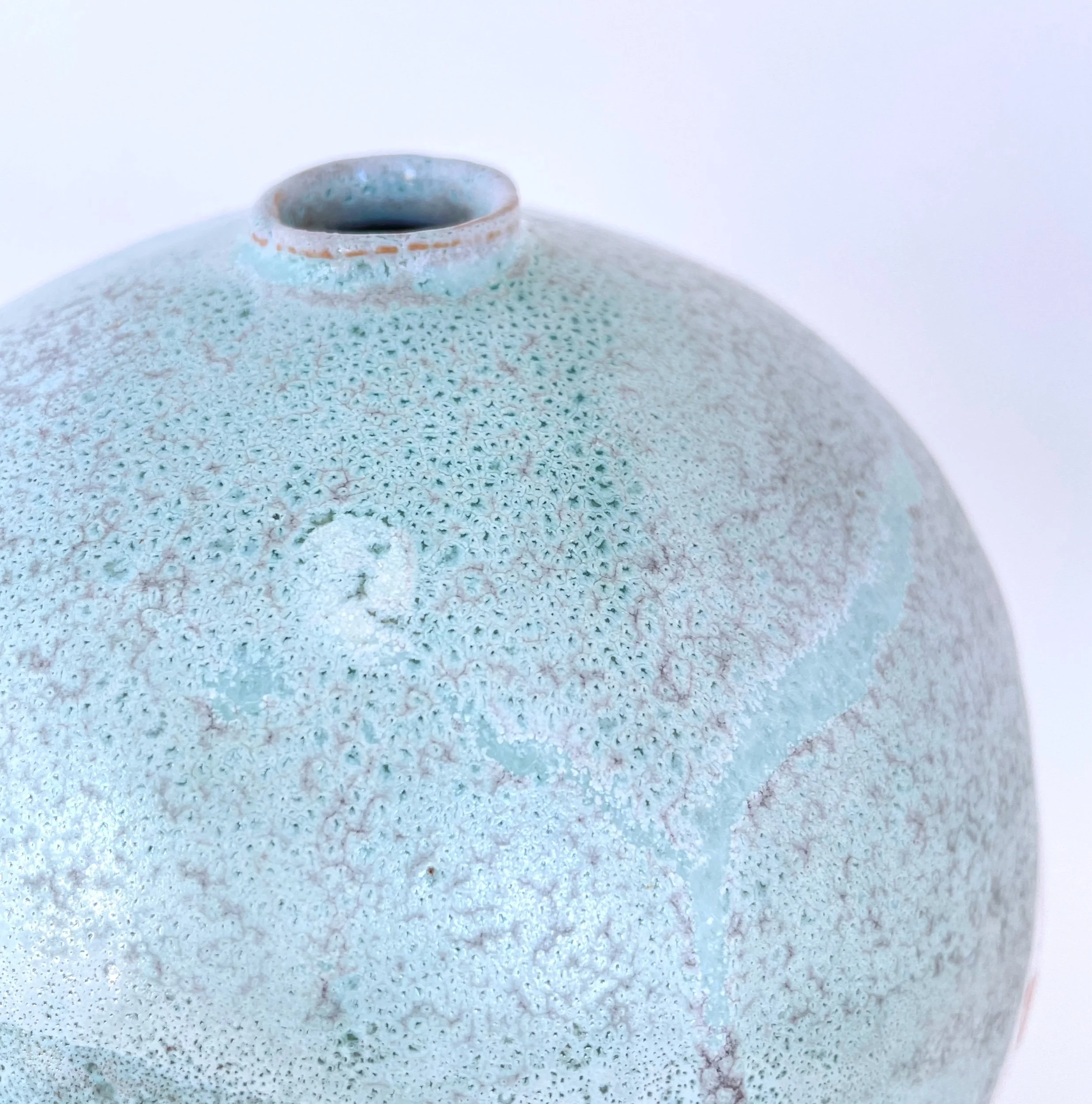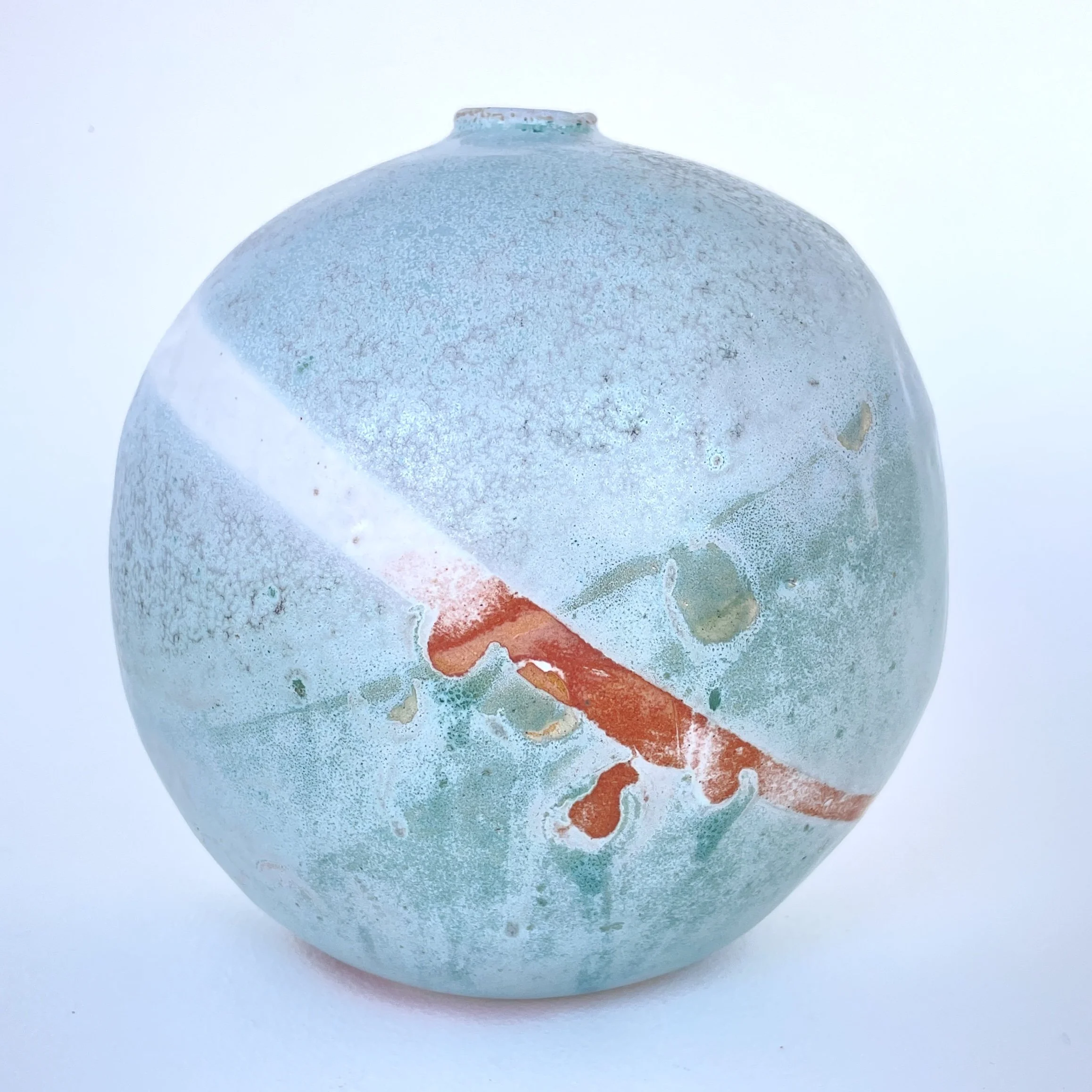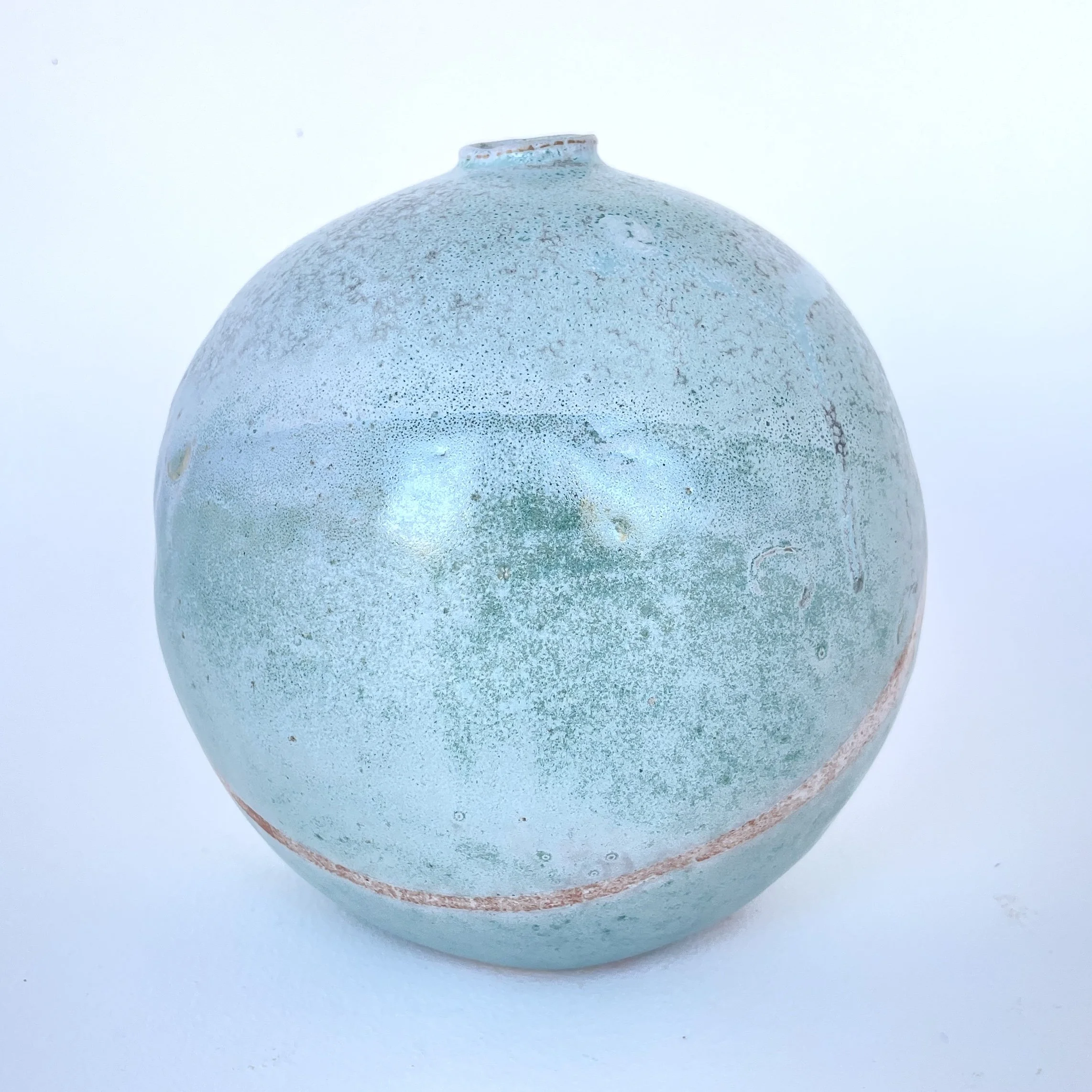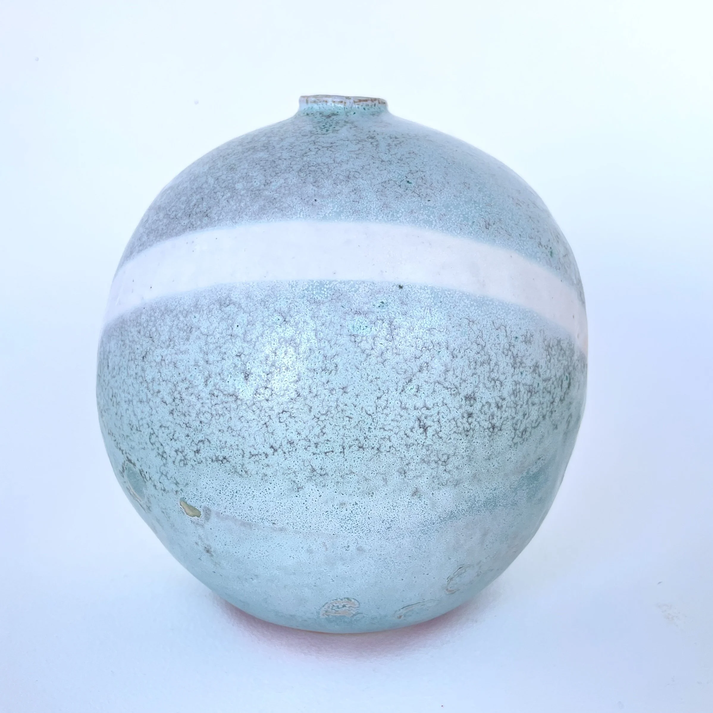 This hand-built orb features a serene palette of misted celadon and pale mineral greens, interrupted by a quiet, snowy band that drifts gently around the form. The surface carries delicate, organic speckling and subtle tonal shifts that invite close looking.