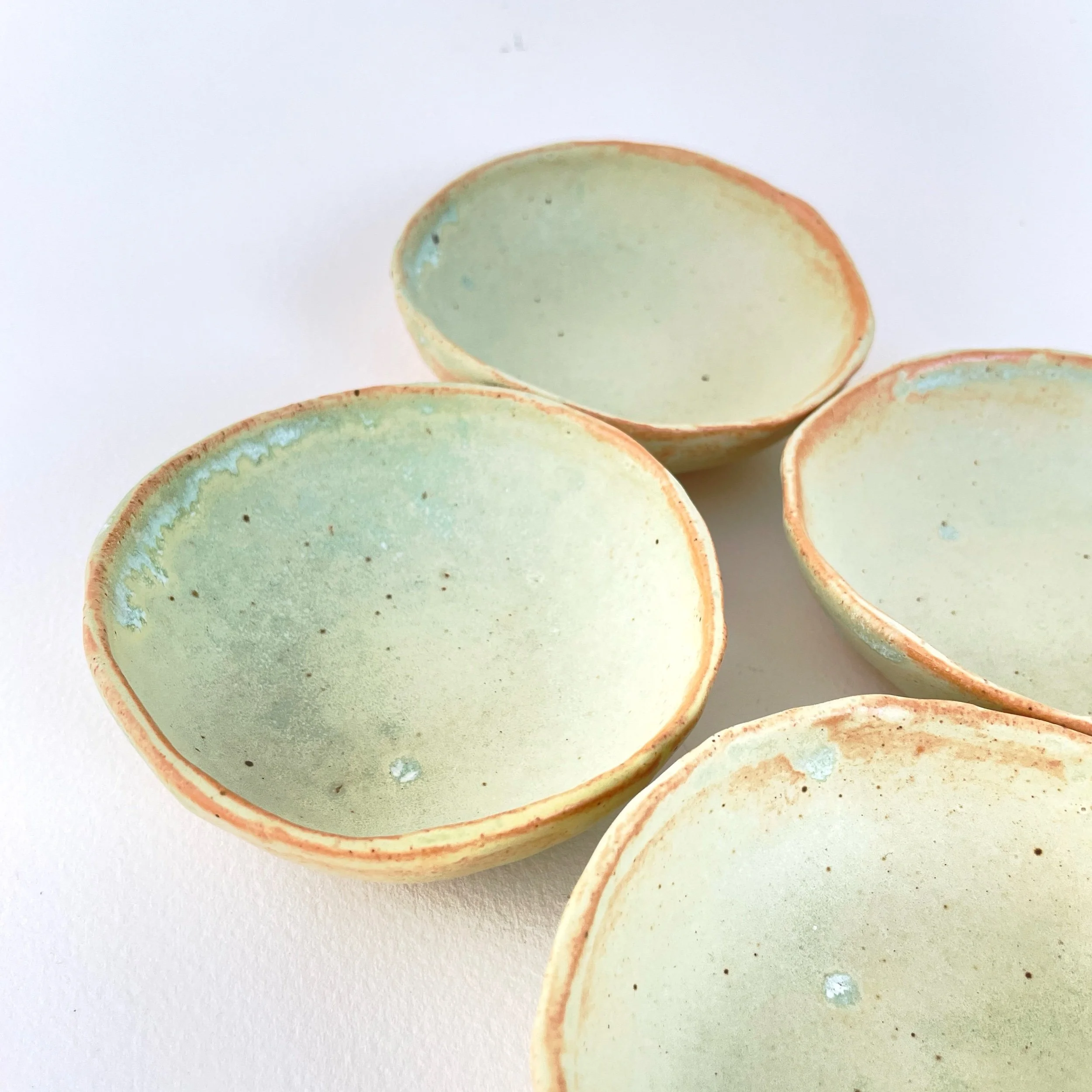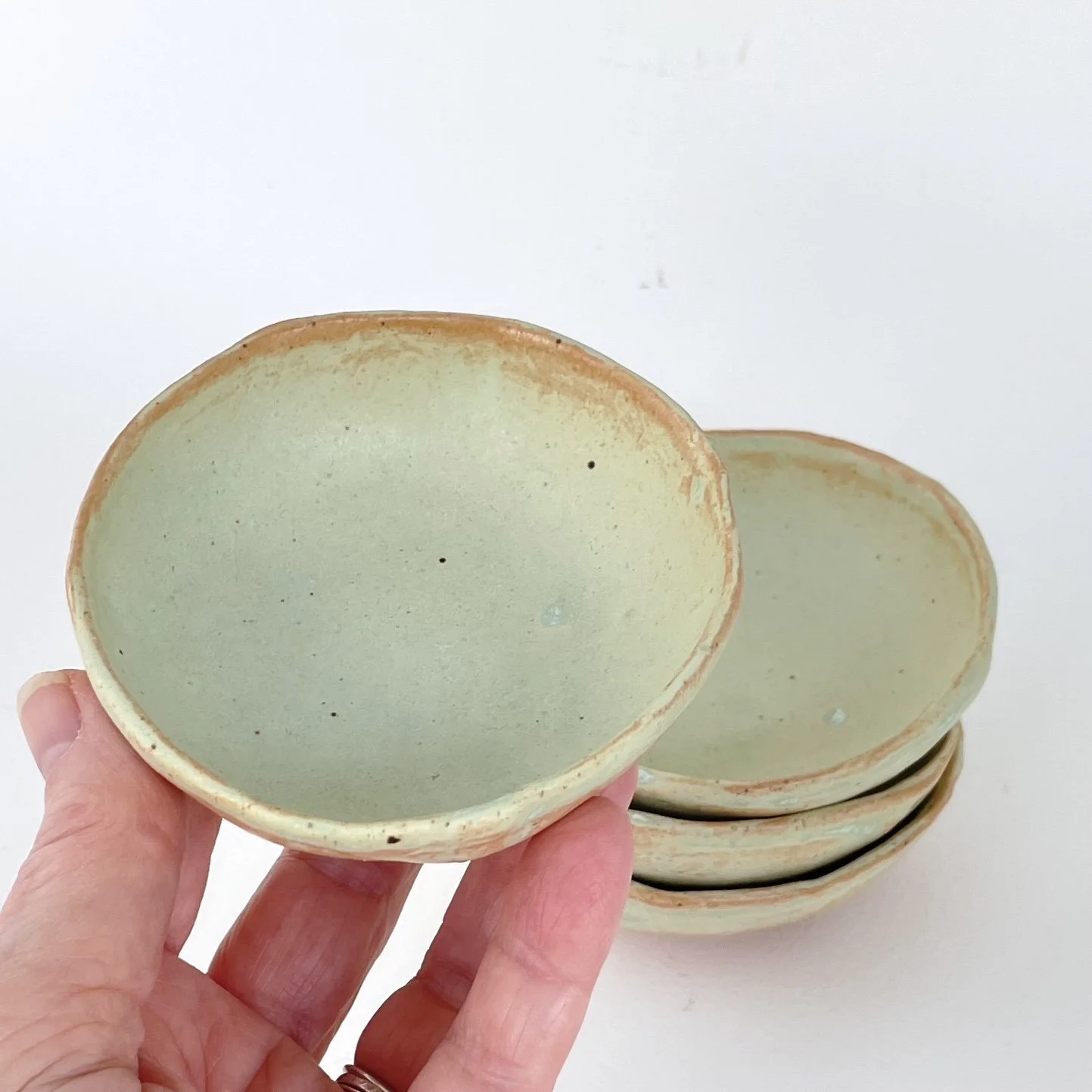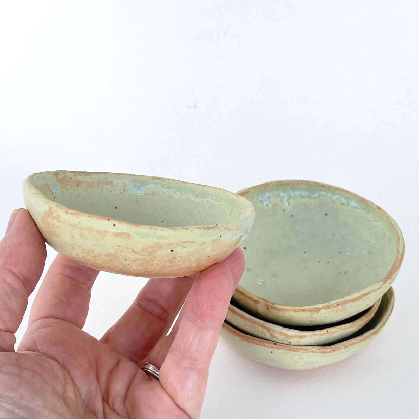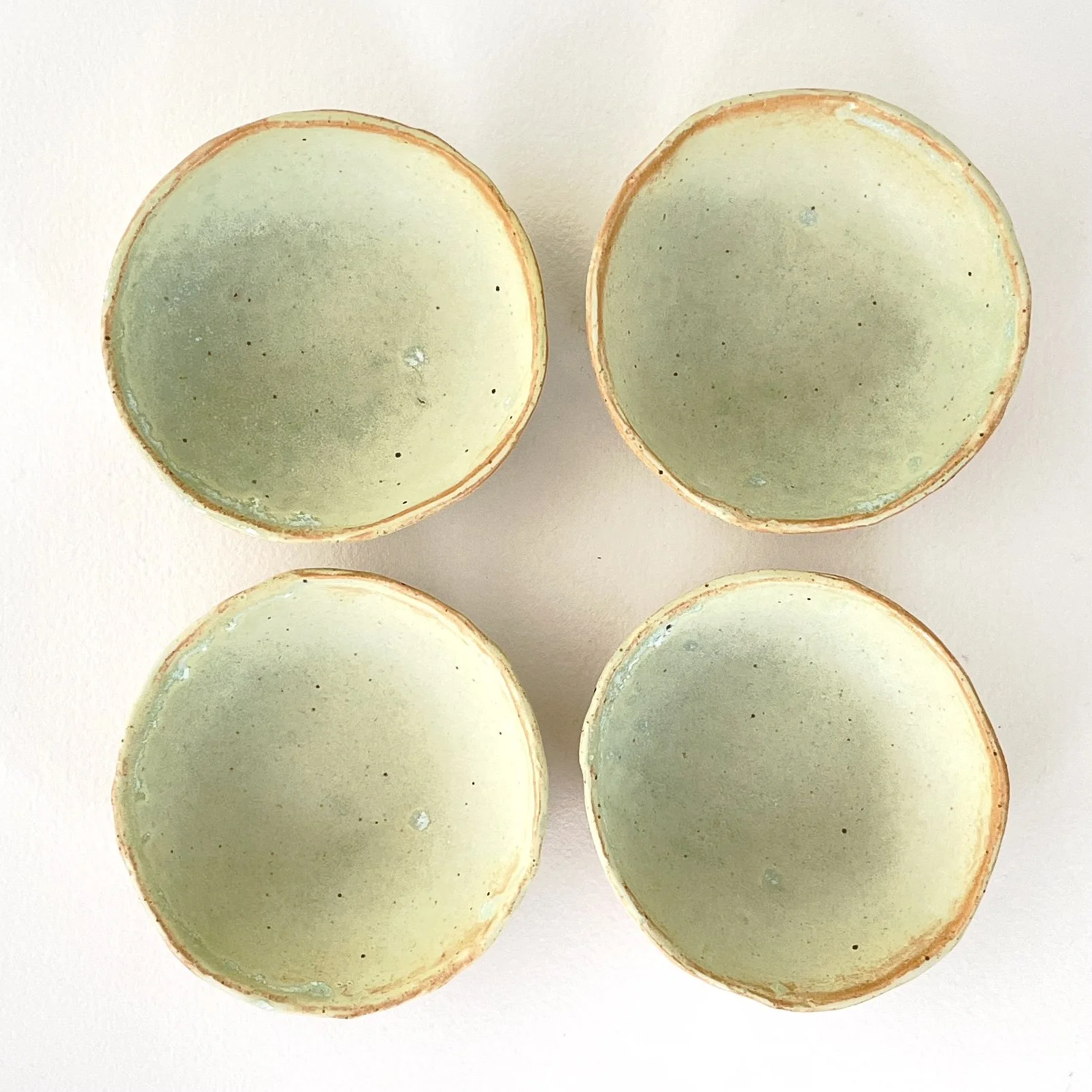 A set of four hand-built ceramic bowls, each uniquely formed with subtle variations that celebrate wabi-sabi beauty. Glazed in soft sage and olive green with natural clay edges, these versatile little bowls invite everyday use. Perfect as salt cellars, spice pinch bowls, or dipping dishes, they also make thoughtful catch-alls for jewelry or keepsakes.