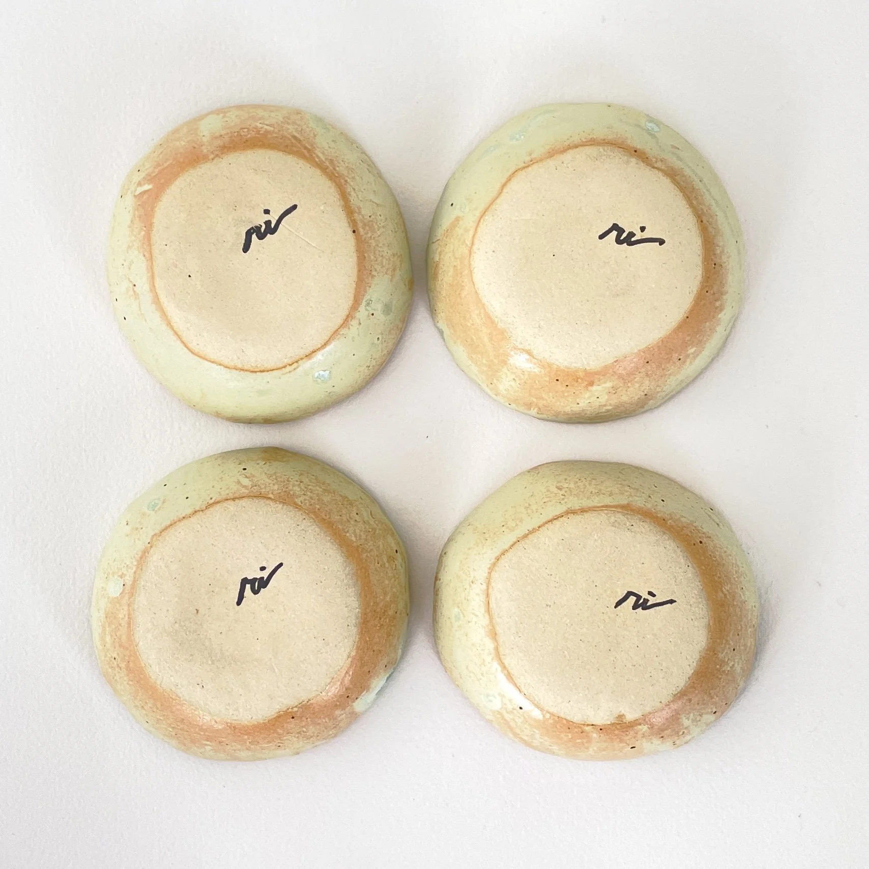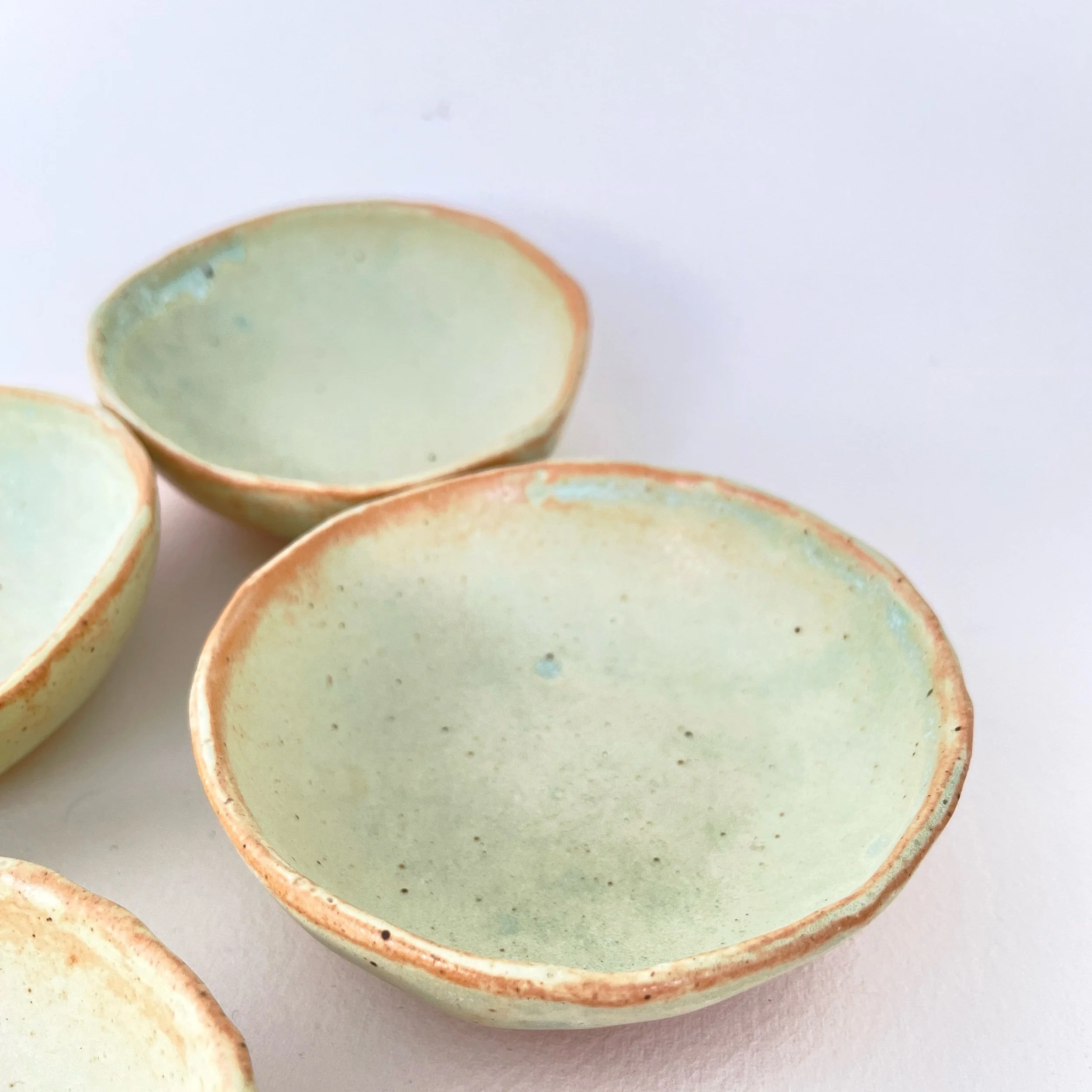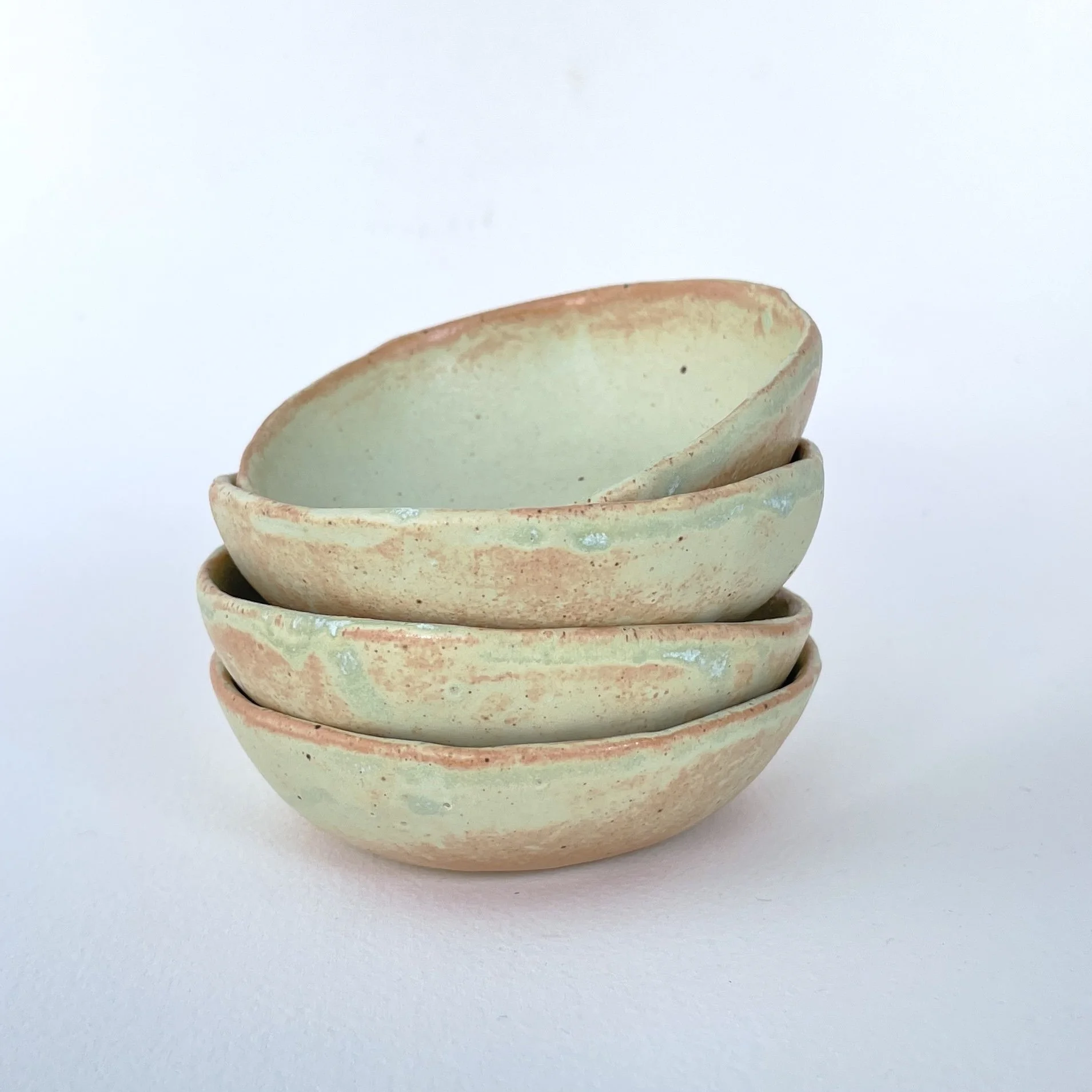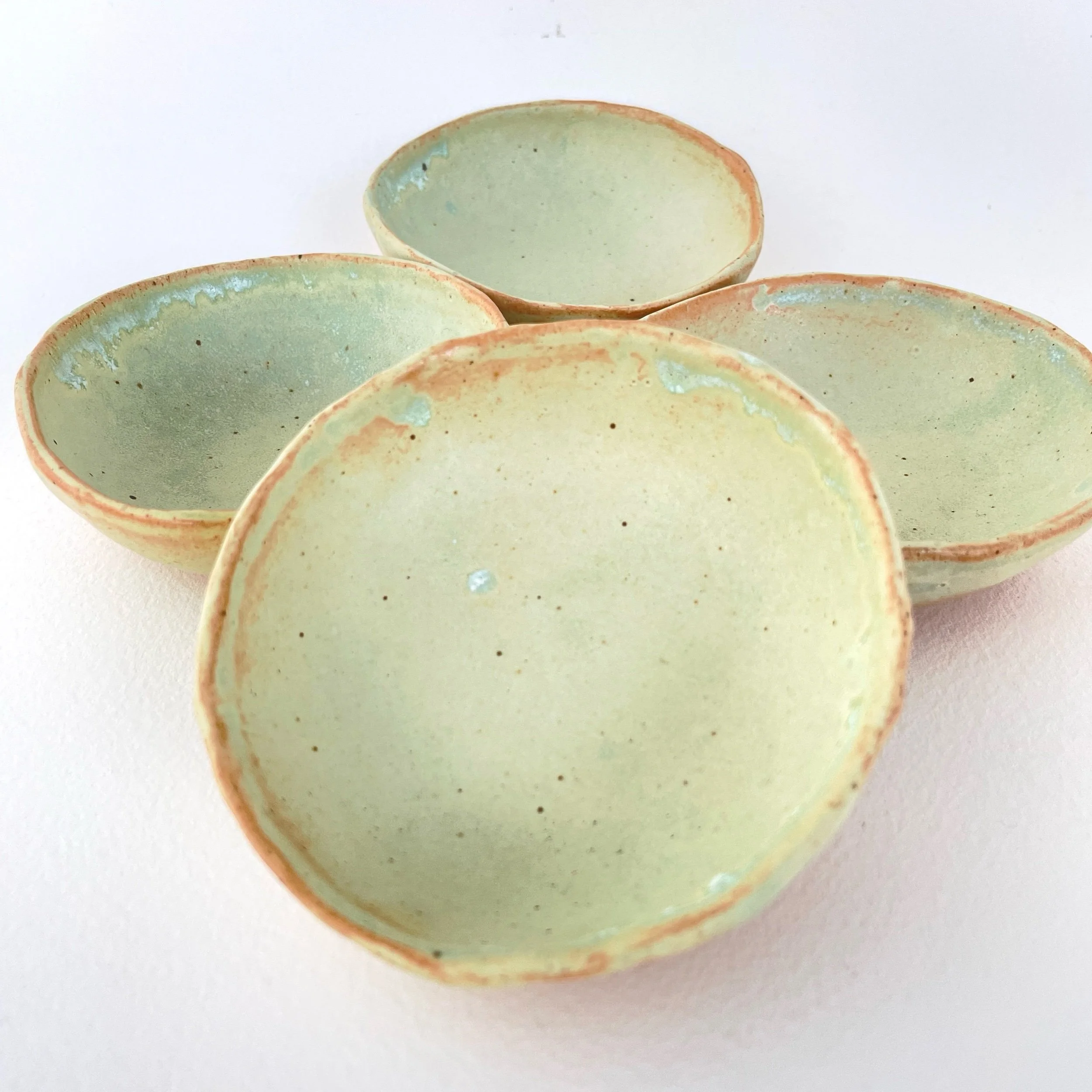 A set of four hand-built ceramic bowls, each uniquely formed with subtle variations that celebrate wabi-sabi beauty. Glazed in soft sage and olive green with natural clay edges, these versatile little bowls invite everyday use. Perfect as salt cellars, spice pinch bowls, or dipping dishes, they also make thoughtful catch-alls for jewelry or keepsakes.