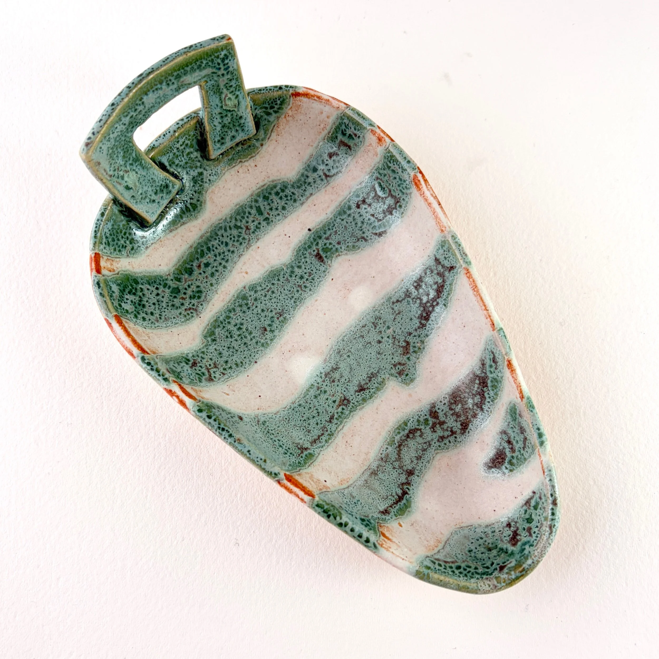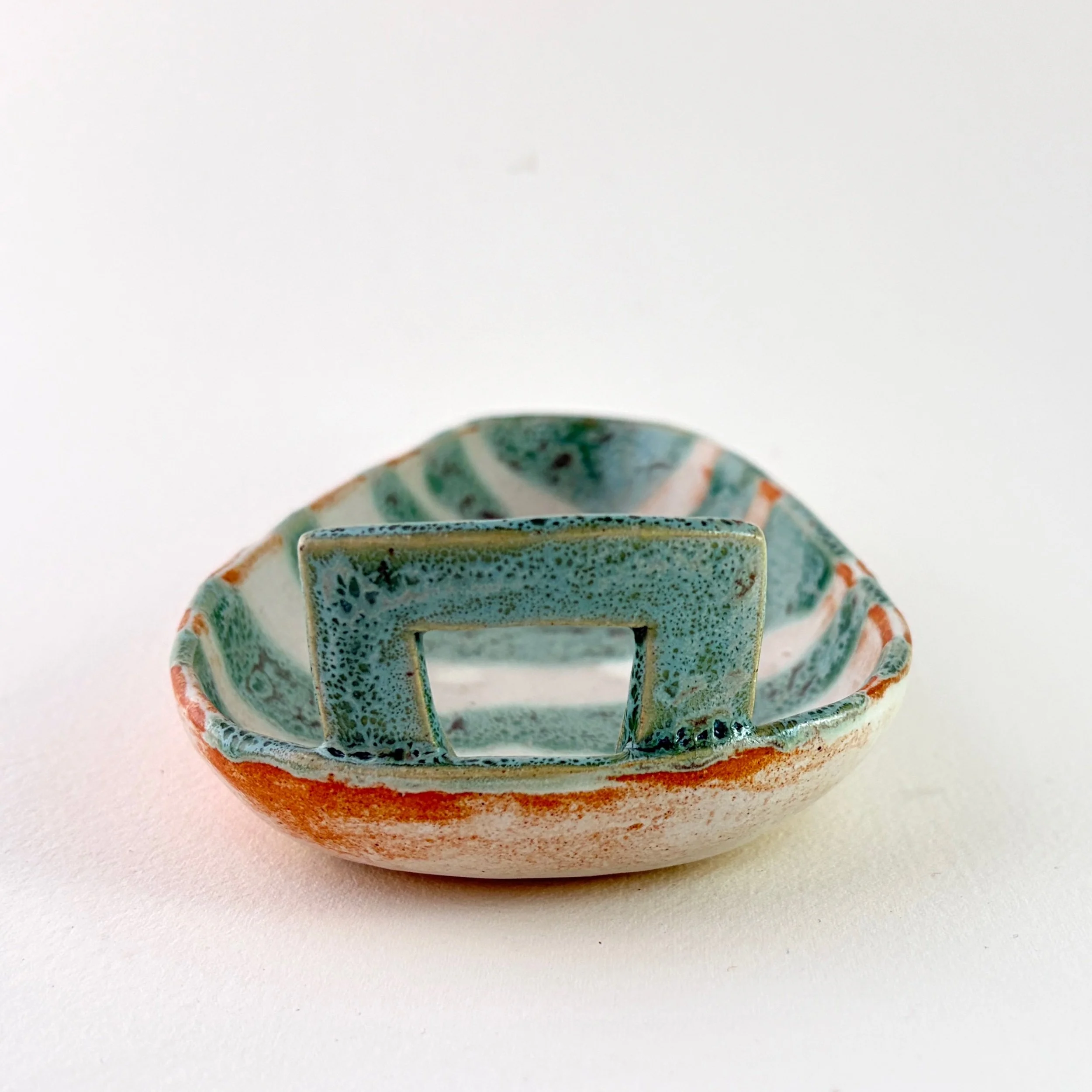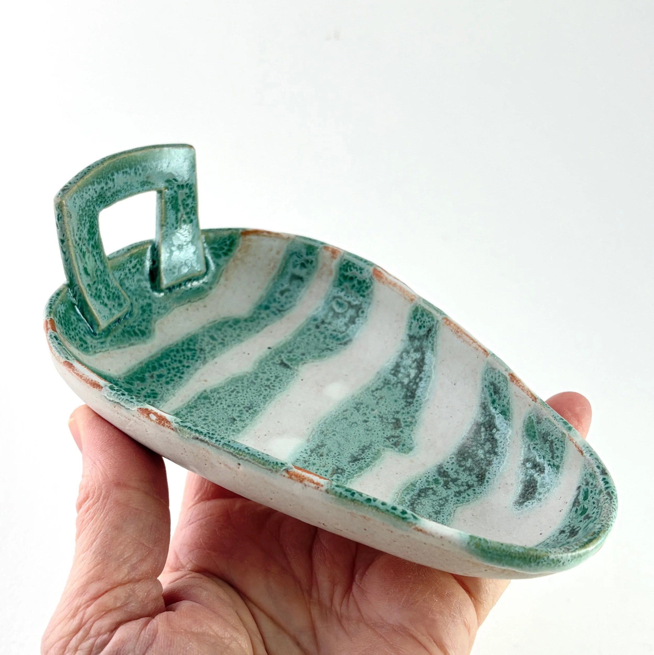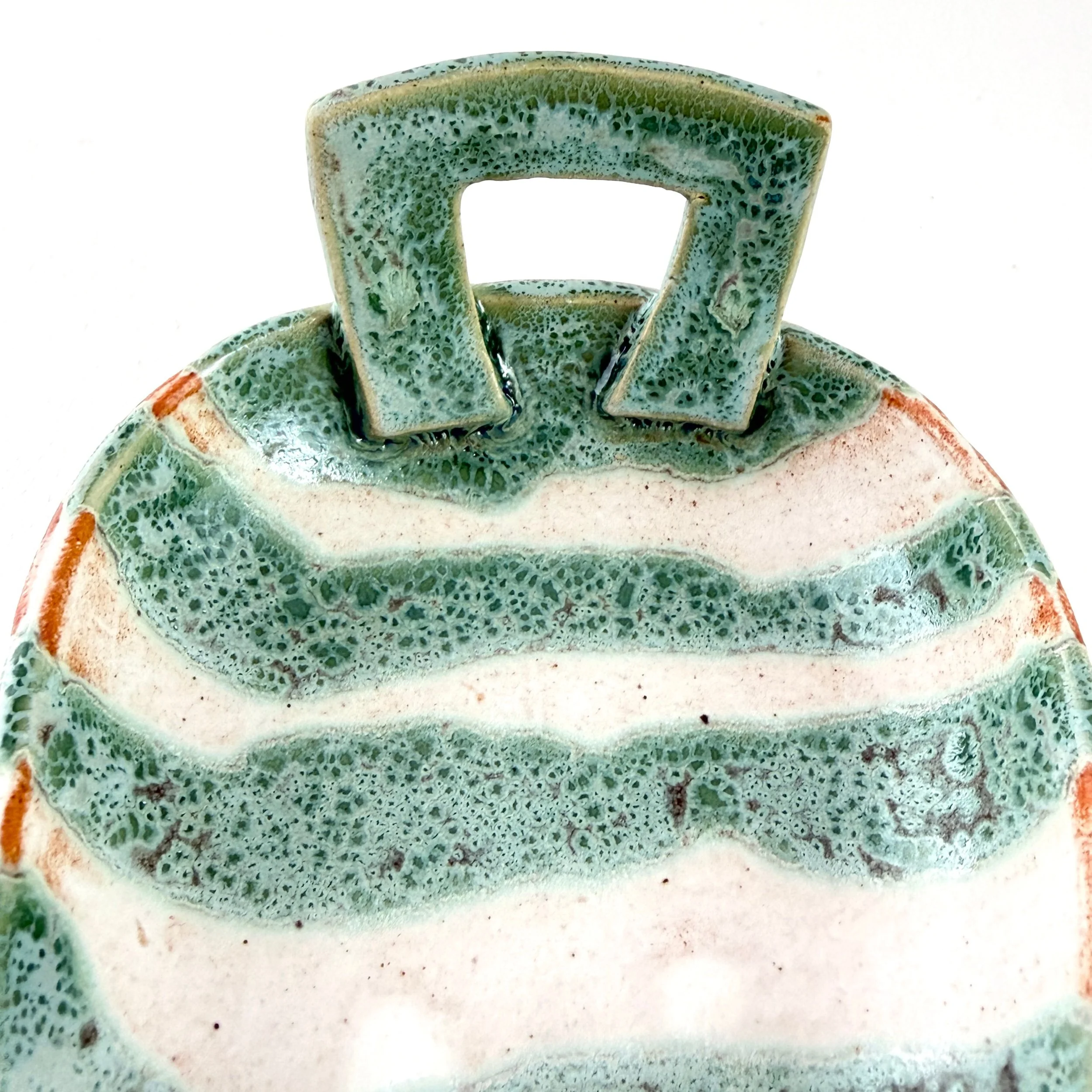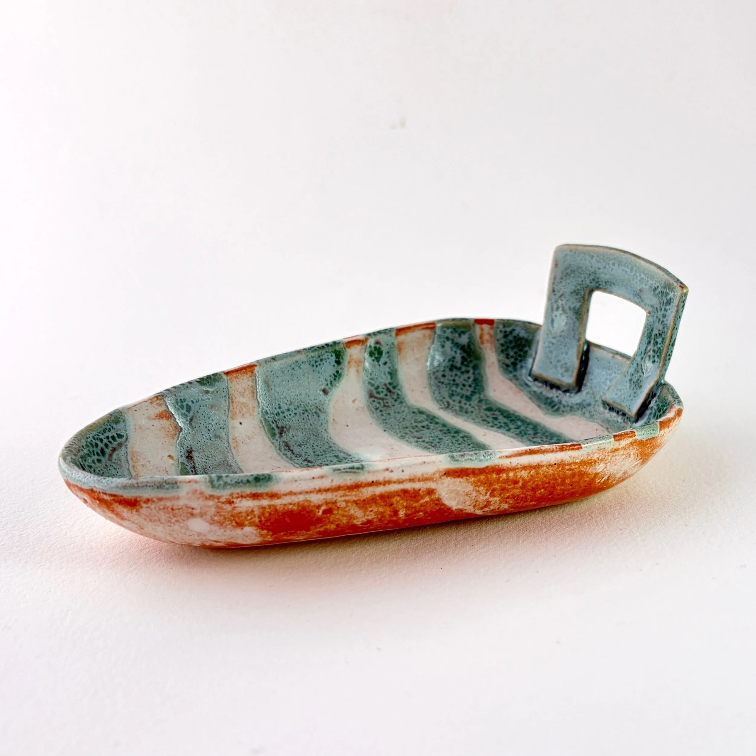 This one-of-a-kind hand-built, handled ceramic tray features flowing bands of soft blue and pale cream. The warm butterscotch exterior whispers over to the blue and cream interior. A satin-matte finish and subtle glaze variation create depth and movement. The organic shape and painterly surface invite both quiet contemplation and functional use.